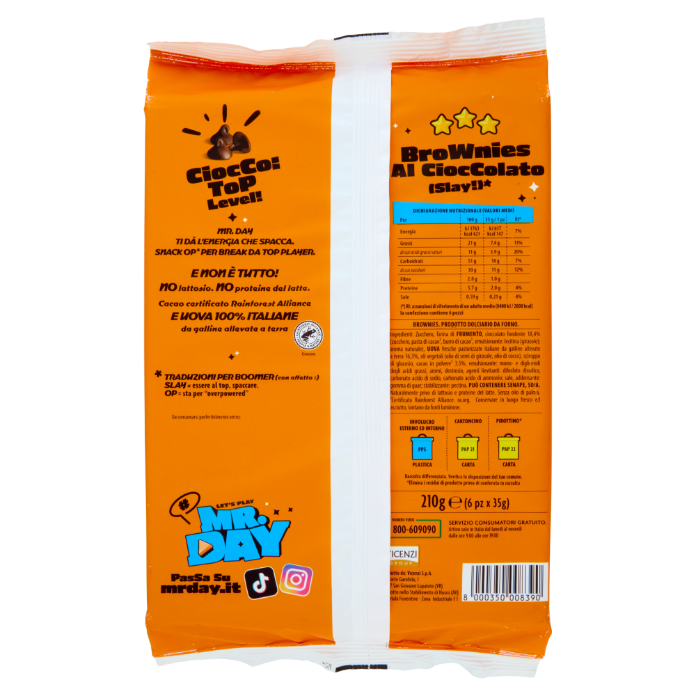 CiocCo: ToP Level! Mr. Day ti dà l'energia che spacca. Snack op* per break da top player. E non è tutto! No lattosio. No proteine del latte. Cacao certificato Rainforest Alliance E Uova 100% Italiane da galline allevate a terra BroWnies Al CiocColato (Slay!)* * Traduzioni per boomer (con affetto :) Slay = essere al top, spaccare. Op = sta per "overpowered"