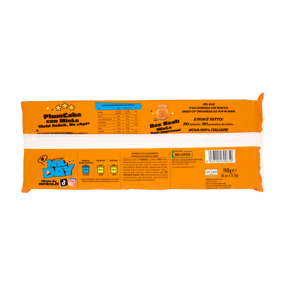 PlumCake con MieLe (Gold SnAck, No cAp)* Bee Real! MieLe Ape-approved Mr.Day ti dà l'energia che spacca. Snack op* per break da top player. E non è tutto! No lattosio. No proteine del latte. Uova 100% Italiane da gallina allevate a terra * Traduzioni per Boomer (con affetto :) Gold snack, no cap = Snack prezioso, sul serio. Op = sta per "overpowered"