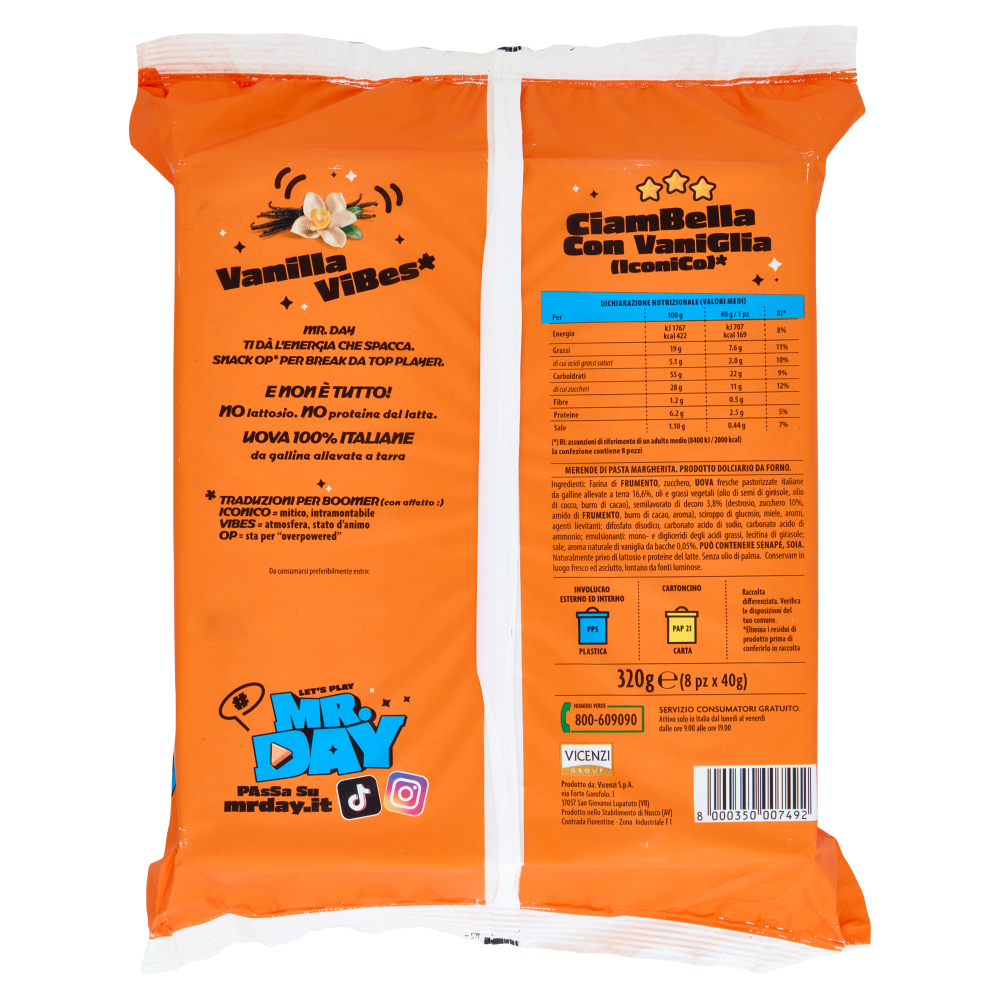 Vanilla ViBes* Mr.Day ti dà l'energia che spacca. Snack op* per break da top player. E non è tutto! No lattosio. No proteine del latte. Uova 100% italiane da galline allevate a terra * Traduzioni per Boomer (con affetto :) Iconico = mitico, intramontabile Vibes = atmosfera, stato d'animo Op = sta per "overpowered" Naturalmente privo di lattosio e proteine del latte. Senza olio di palma.