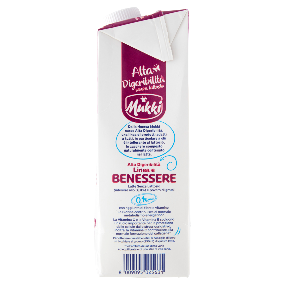 Dalla ricerca Mukki nasce Alta Digeribilità, una linea di prodotti adatti a tutti, in particolare a chi è intollerante al lattosio, lo zucchero composto naturalmente contenuto nel latte. Latte Senza Lattosio (inferiore allo 0,01%) e povero di grassi con aggiunta di fibre e vitamine. La Biotina contribuisce al normale metabolismo energetico*. La Vitamina C e la Vitamina E svolgono un ruolo importante per la protezione delle cellule dallo stress ossidativo, inoltre, la Vitamina C contribuisce alla normale formazione del collagene*. Per ottenere questi benefici si consiglia di bere un bicchiere al giorno (250ml) di questo latte. *nell'ambito di una dieta varia ed equilibrata e di uno stile di vita sano. Il prodotto contiene glucosio e galattosio in conseguenza della scissione del lattosio.