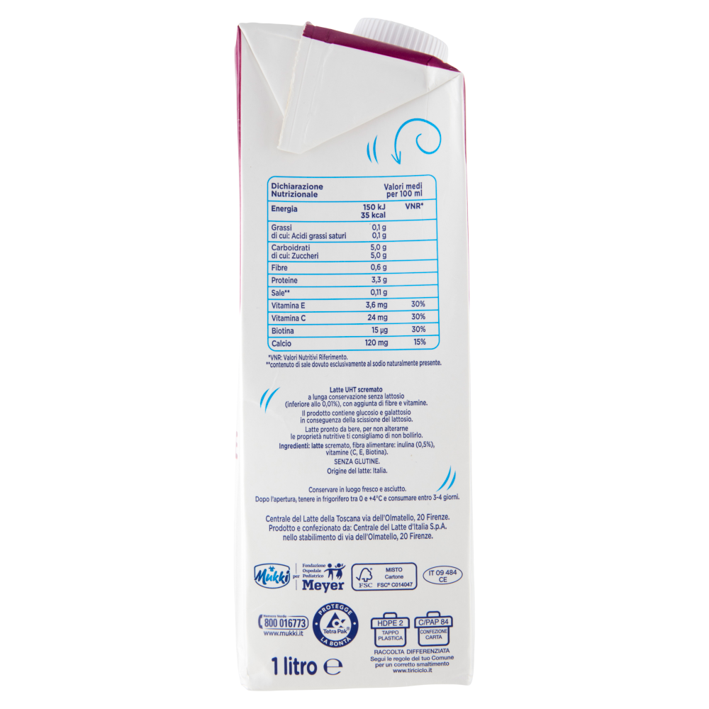 Senza glutineLatte UHT scremato a lunga conservazione senza lattosio (inferiore allo 0,01%), con aggiunta di fibre e vitamine
