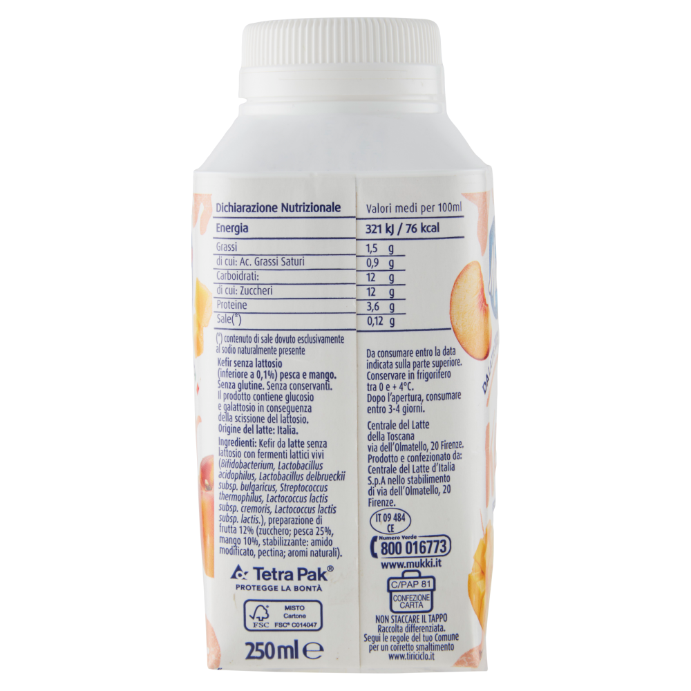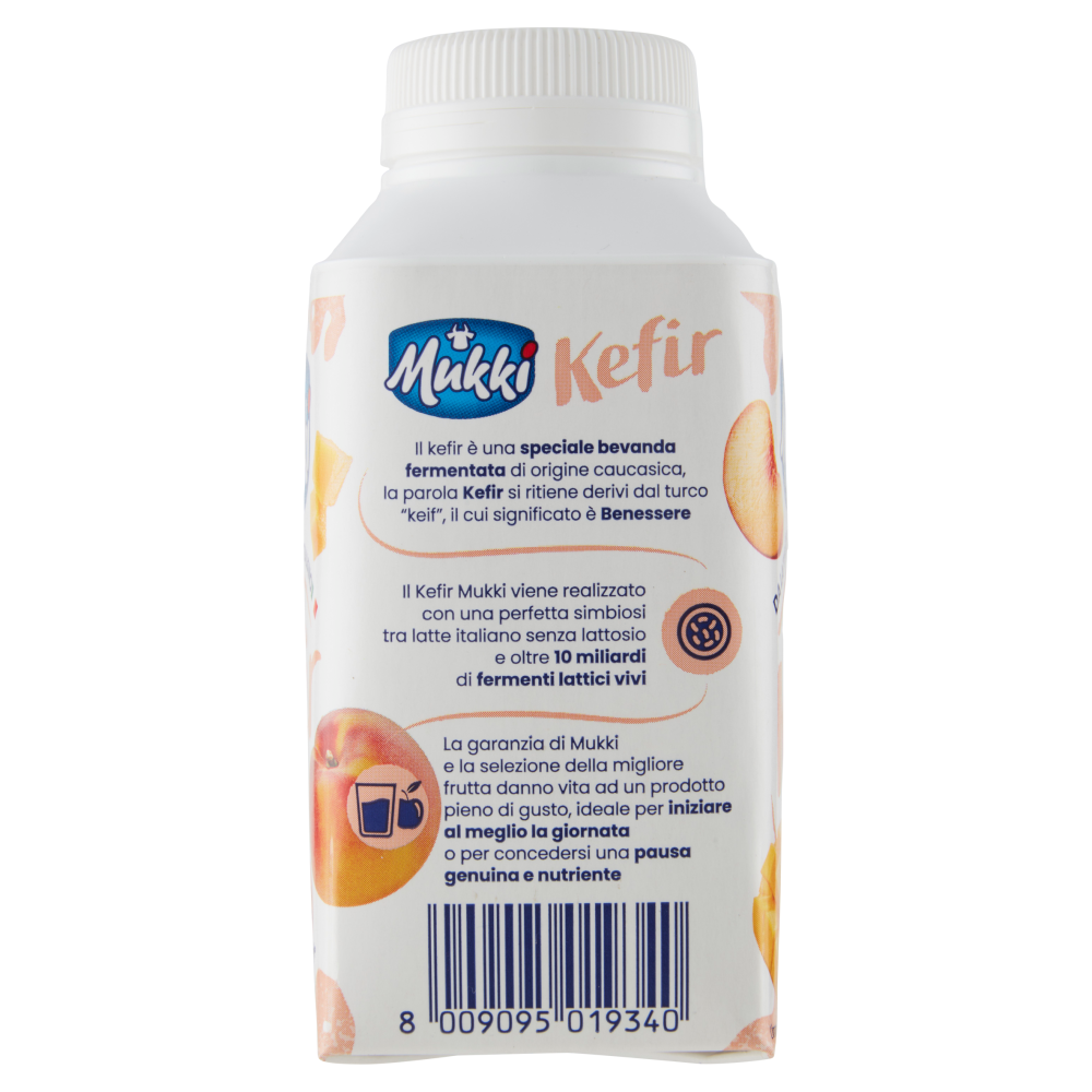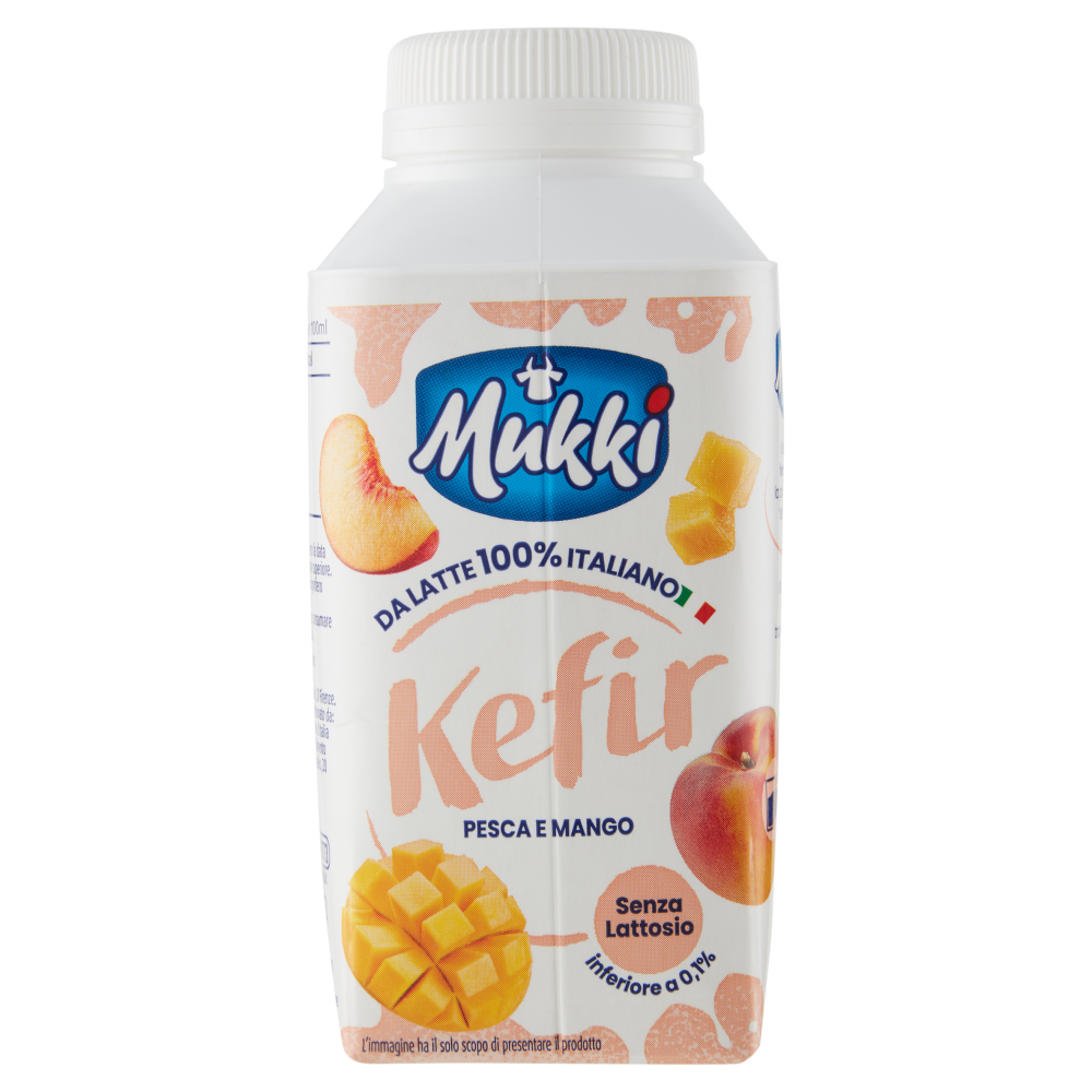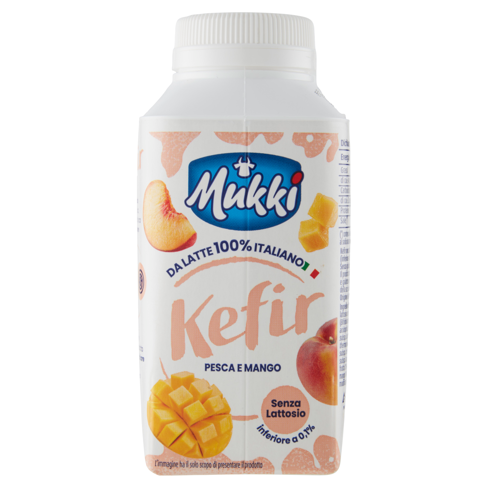 Il prodotto contiene glucosio e galattosio in conseguenza della scissione del lattosio. Il kefir è una speciale bevanda fermentata di origine caucasica, la parola Kefir si ritiene derivi dal turco "keif", il cui significato è Benessere Il Kefir Mukki viene realizzato con una perfetta simbiosi tra latte italiano senza lattosio e oltre 10 miliardi di fermenti lattici vivi