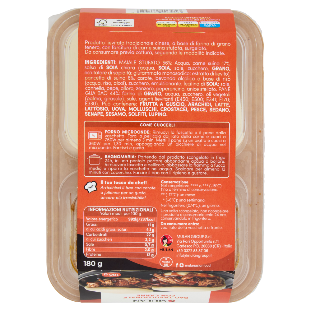 Come cuocerli Forno microonde: Rimuovi la fascetta e il pane dalla vaschetta. Fora la pellicola dal lato della carne e cuoci a 750w per almeno 3 min. Metti il pane su un piatto e cuoci a 360w per 1,30 min, appoggiando un bicchiere di acqua nel microonde. Farcisci e gusta. Bagnomaria: Partendo dal prodotto scongelato in frigo 24h, in una pentola portare abbondante acqua a bollore. Rimuovere fascetta e pellicola, abbassare la fiamma a fuoco medio e riporre la vaschetta nell'acqua. Scaldare per almeno 12 minuti con coperchio. Farcire il bao con il ripieno e gustare. Il tuo tocco da chef! Arricchisci il bao con carote a julienne per un gusto ancora più irresistibile!