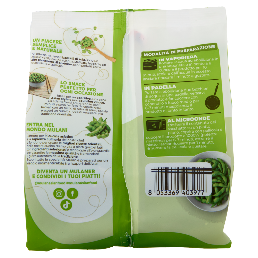 Un piacere semplice e naturale Gli edamame, teneri baccelli di soia, sono un classico della cucina asiatica. Delicati, leggeri e ad alto contenuto di proteine, sono perfetti come snack sano e gustoso. Lo snack perfetto per ogni occasione Ideali per un aperitivo, una cena Asian style o uno spuntino veloce. Gli edamame si preparano in pochi minuti e sono perfetti da condividere. Provali con un tocco di salsa di soia o spezie e scopri un nuovo modo di assaporare la tradizione orientale.