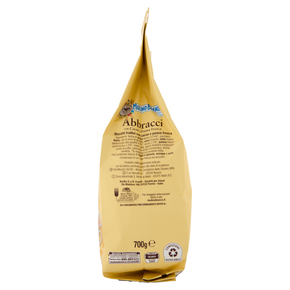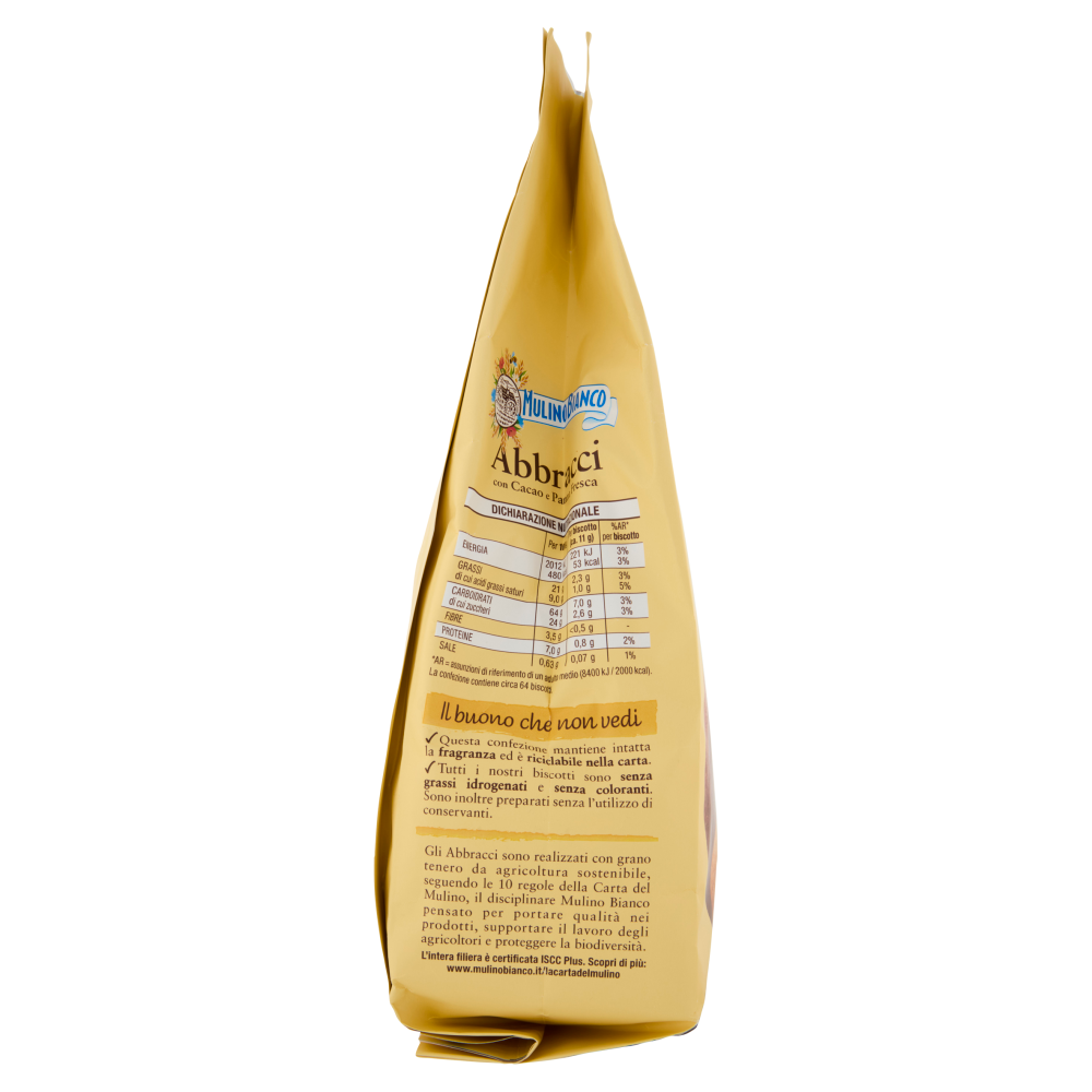 Il buono che non vedi - Questa confezione mantiene intatta la fragranza ed è riciclabile nella carta. - Tutti i nostri biscotti sono senza grassi idrogenati e senza coloranti. Sono inoltre preparati senza l'utilizzo di conservanti. Gli Abbracci sono realizzati con grano tenero da agricoltura sostenibile, seguendo le 10 regole della Carta del Mulino, il disciplinare Mulino Bianco pensato per portare qualità nei prodotti, supportare il lavoro degli agricoltori e proteggere la biodiversità. L'intera filiera è certificata ISCC Plus. Scopri di più: www.mulinobianco.it/lacartadelmulino