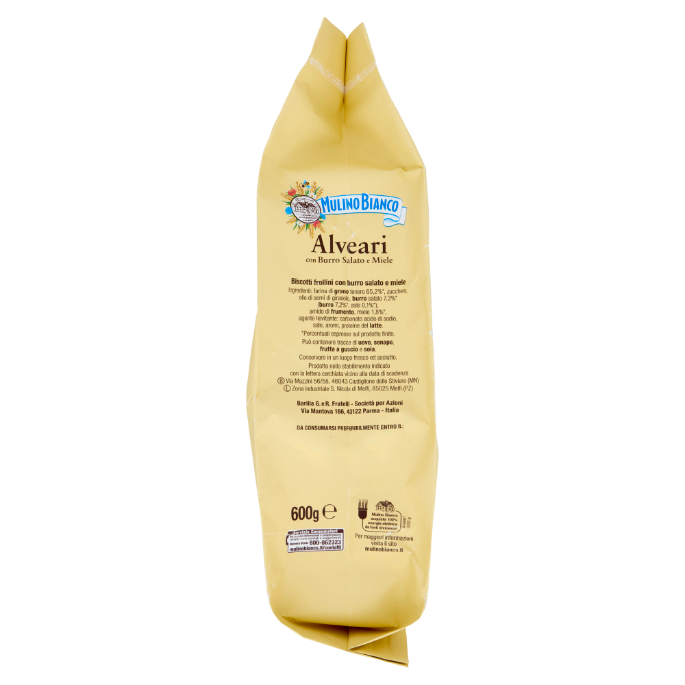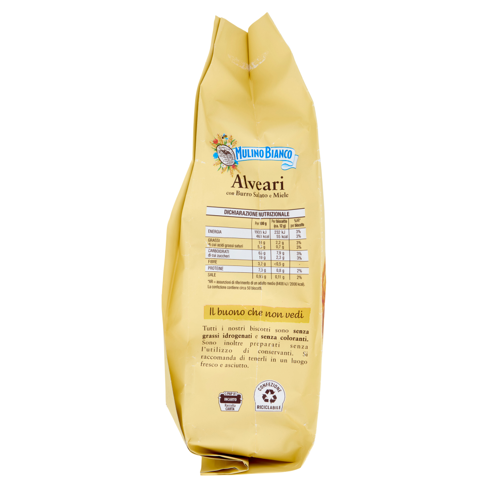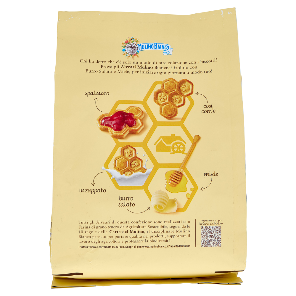 Chi ha detto che c'è solo un modo di fare colazione con i biscotti? Prova gli Alveari Mulino Bianco: i frollini con Burro Salato e Miele, per iniziare ogni giornata a modo tuo! spalmato così com'è inzuppato miele burro salato Tutti gli Alveari di questa confezione sono realizzati con Farina di grano tenero da Agricoltura Sostenibile, seguendo le 10 regole della Carta del Mulino, il disciplinare Mulino Bianco pensato per portare qualità nei prodotti, supportare il lavoro degli agricoltori e proteggere la biodiversità. L'intera filiera è certificata ISCC Plus. Scopri di più: www.mulinobianco.it/lacartadelmulino Il buono che non vedi Tutti i nostri biscotti sono senza grassi idrogenati e senza coloranti. Sono inoltre preparati senza l'utilizzo di conservanti. Si raccomanda di tenerli in un luogo fresco e asciutto.