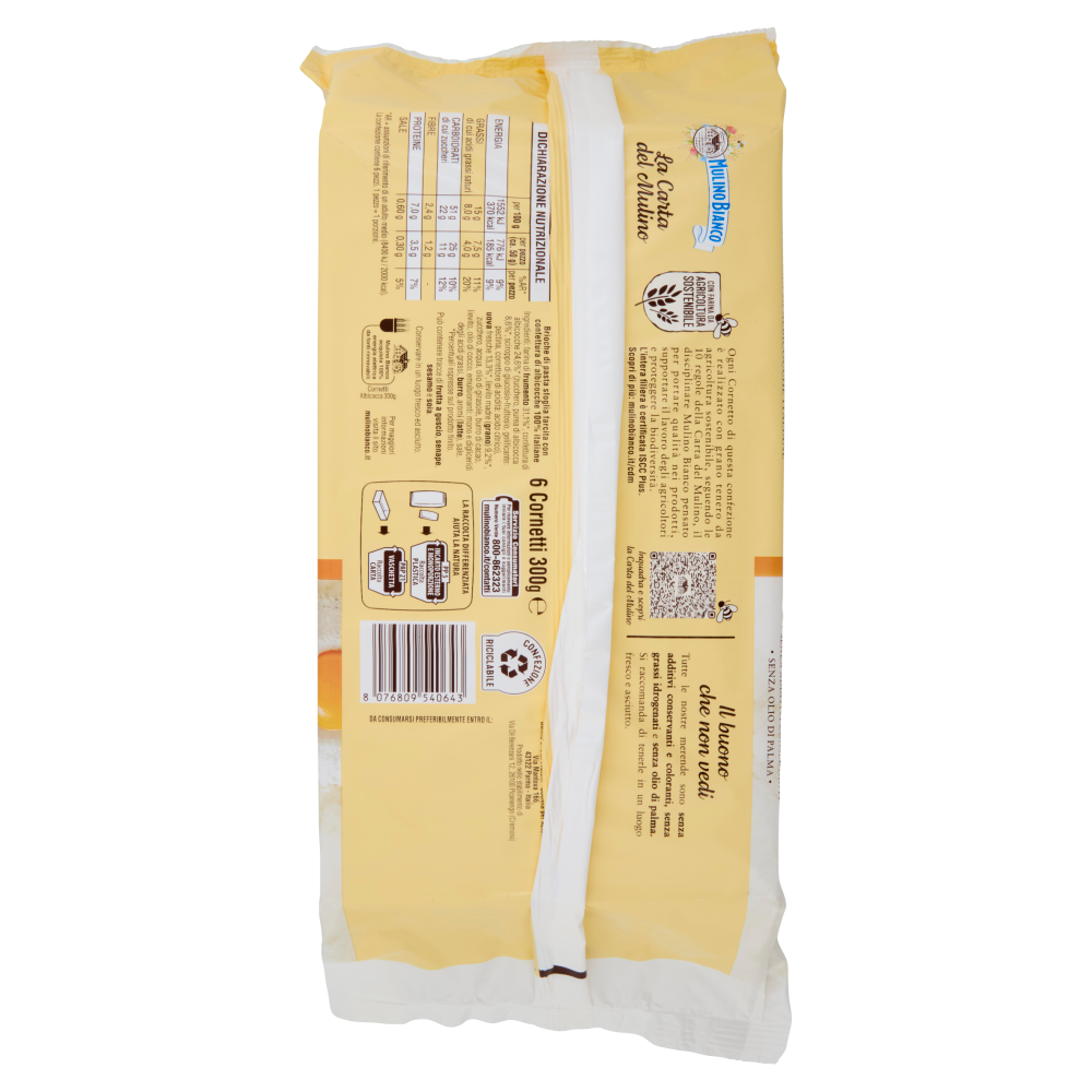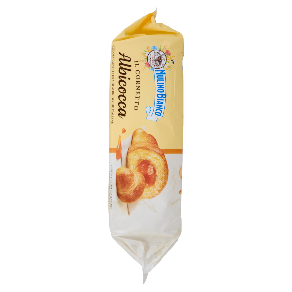 La Carta del Mulino Con farina da agricoltura sostenibile Ogni Cornetto di questa confezione è realizzato con grano tenero da agricoltura sostenibile, seguendo le 10 regole della Carta del Mulino, il disciplinare Mulino Bianco pensato per portare qualità nei prodotti, supportare il lavoro degli agricoltori e proteggere la biodiversità. L'intera filiera è certificata ISCC Plus. Scopri di più: mulinobianco.it/cdm Il buono che non vedi Tutte le nostre merende sono senza additivi conservanti e coloranti, senza grassi idrogenati e senza olio di palma. Si raccomanda di tenerle in un luogo fresco e asciutto. Con lievito di madre - 38 Ore di lenta lievitazione Un ricco impasto lievitato lentamente e lavorato in soffici strati di pasta sfoglia, incontra una golosa farcitura, preparata con albicocche 100% italiane e senza utilizzo di additivi conservanti: così nasce il Cornetto Albicocca Mulino Bianco.