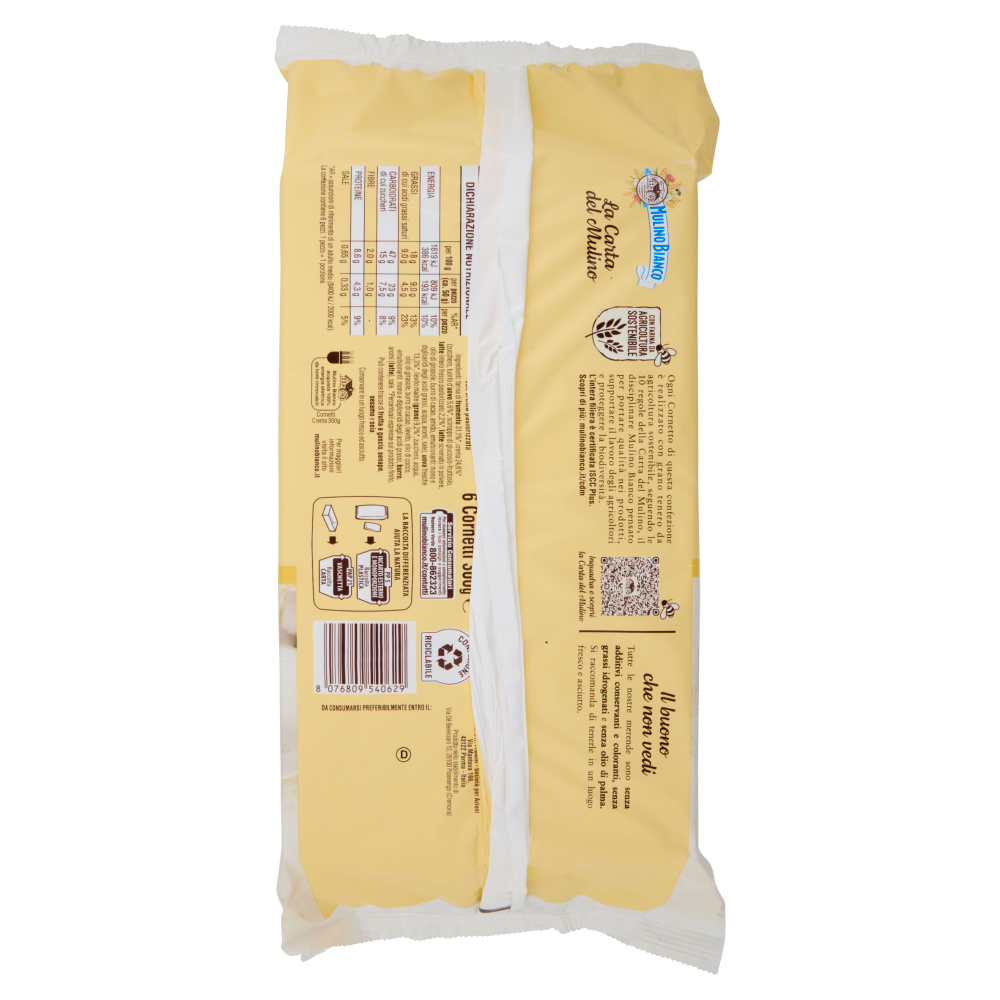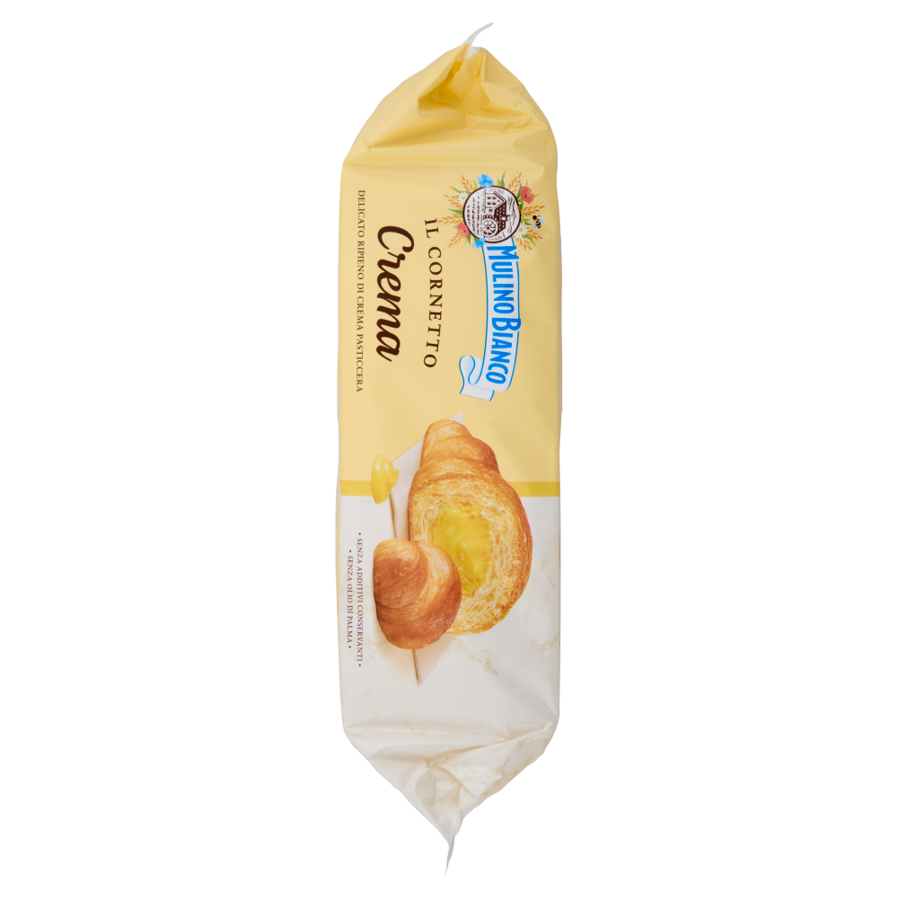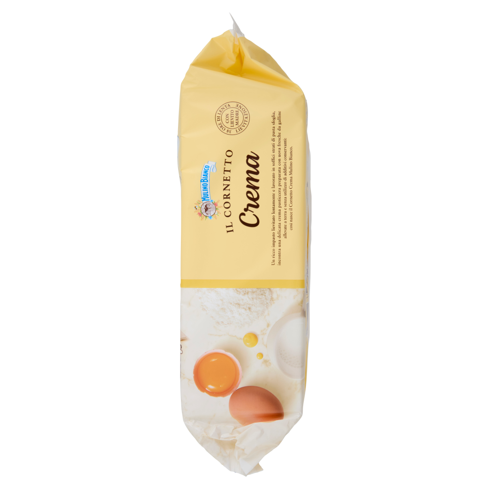 La Carta del Mulino Con farina da agricoltura sostenibile Ogni Cornetto di questa confezione è realizzato con grano tenero da agricoltura sostenibile, seguendo le 10 regole della Carta del Mulino, il disciplinare Mulino Bianco pensato per portare qualità nei prodotti, supportare il lavoro degli agricoltori e proteggere la biodiversità. L'intera filiera è certificata ISCC Plus. Scopri di più: mulinobianco.it/cdm Il buono che non vedi Tutte le nostre merende sono senza additivi conservanti e coloranti, senza grassi idrogenati e senza olio di palma. Si raccomanda di tenerle in un luogo fresco e asciutto. Con lievito di madre - 38 Ore di lenta lievitazione Un ricco impasto lievitato lentamente e lavorato in soffici strati di pasta sfoglia, incontra una delicata crema pasticcera preparata con uova fresche da galline allevate a terra e senza utilizzo di additivi conservanti: così nasce il Cornetto Crema Mulino Bianco.