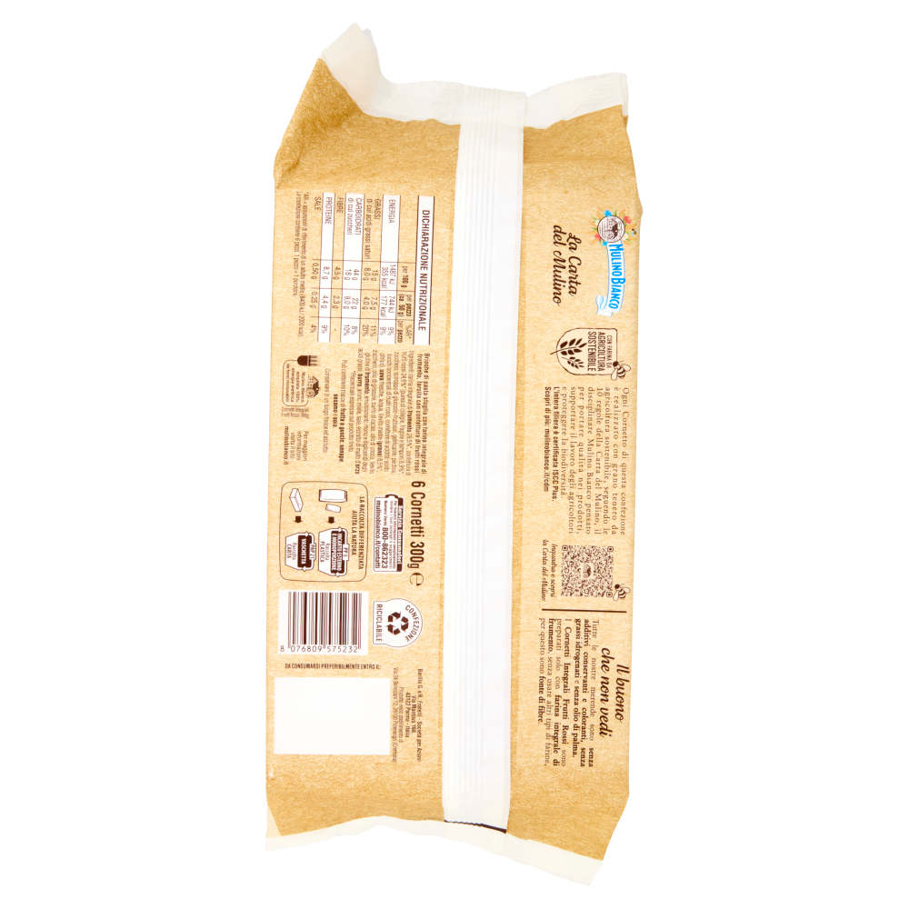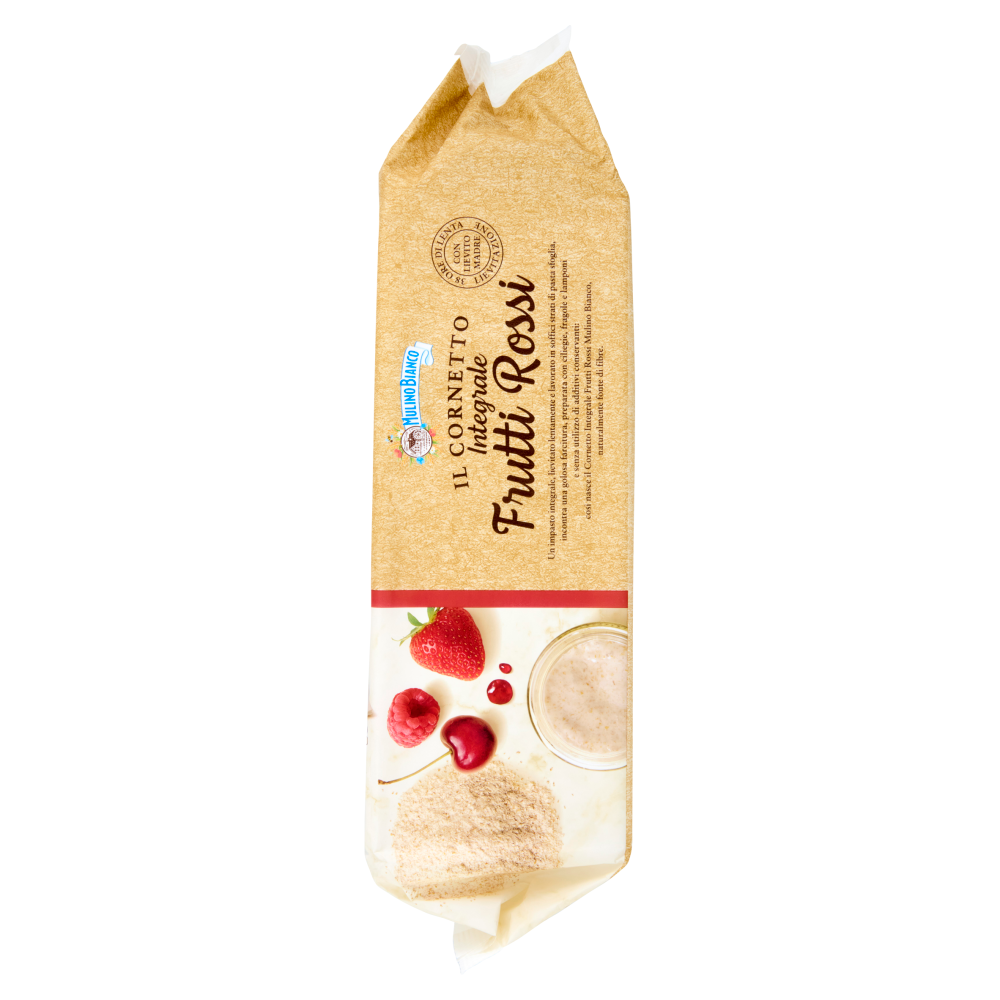 La Carta del Mulino Con farina da agricoltura sostenibile Ogni Cornetto di questa confezione è realizzato con grano tenero da agricoltura sostenibile, seguendo le 10 regole della Carta del Mulino, il disciplinare Mulino Bianco pensato per portare qualità nei prodotti, supportare il lavoro degli agricoltori e proteggere la biodiversità. L'intera filiera è certificata ISCC Plus. Scopri di più: mulinobianco.it/cdm Il buono che non vedi Tutte le nostre merende sono senza additivi conservanti e coloranti, senza grassi idrogenati e senza olio di palma. I Cornetti Integrali Frutti Rossi sono preparati solo con farina integrale di frumento, senza usare altri tipi di farine, per questo sono fonte di fibre. Con lievito madre - 38 Ore di lenta lievitazione Un impasto integrale, lievitato lentamente e lavorato in soffici strati di pasta sfoglia, incontra una golosa farcitura, preparata con ciliegie, fragole e lamponi e senza utilizzo di additivi conservanti: così nasce il Cornetto Integrale Frutti Rossi Mulino Bianco, naturalmente fonte di fibre.