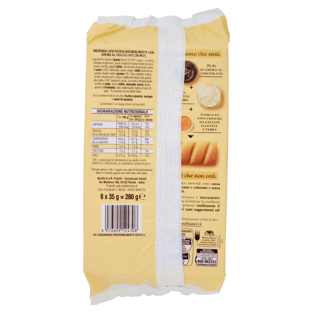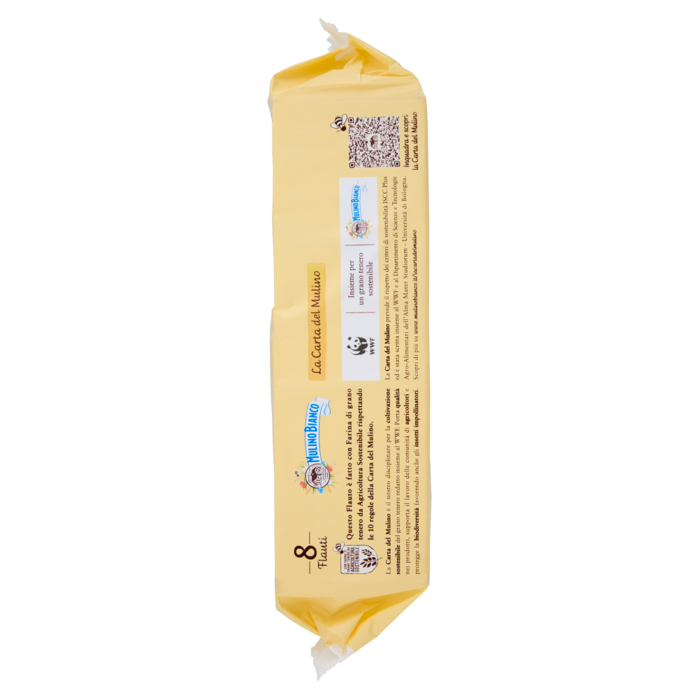 Tutto il buono che senti 39,4% di crema al cioccolato + Con lievito madre + Tuorlo da uova fresche da galline allevate a terra Il buono che non vedi - Tutte le nostre merende sono senza additivi conservanti e coloranti e senza grassi idrogenati. - Questa confezione è interamente riciclabile. Prima di buttare la vaschetta pensa a come potresti riutilizzarne il cartoncino, trovi tanti suggerimenti sul nostro sito. Variare spesso i cibi e seguire uno stile di vita fisicamente attivo è il modo giusto per aver una vita sana. La Carta del Mulino Con farina di grano tenero da agricoltura sostenibile Questo Flauto è fatto con Farina di grano tenero da Agricoltura Sostenibile rispettando le 10 regole della Carta del Mulino. La Carta del Mulino è il nostro disciplinare per la coltivazione sostenibile del grano tenero redatto insieme al WWF. Porta qualità nei prodotti, supporta il lavoro delle comunità di agricoltori e protegge la biodiversità favorendo anche gli insetti impollinatori. Insieme per un grano tenero sostenibile La Carta del Mulino prevede il rispetto dei criteri di sostenibilità ISCC Plus ed è stata scritta insieme al WWF e al Dipartimento di Scienze e Tecnologie Agro-Alimentari dell'Alma Mater Studiorum - Università di Bologna. Scopri di più su www.mulinobianco.it/lacartadelmulino 1 Flauto Cioccolato (35g) + 1 bicchiere di latte parzialmente scremato (125ml) apportano circa 763 kJ/182 kcal pari al 9% dell'assunzione di riferimento di un adulto medio (8400 kJ / 2000 kcal).