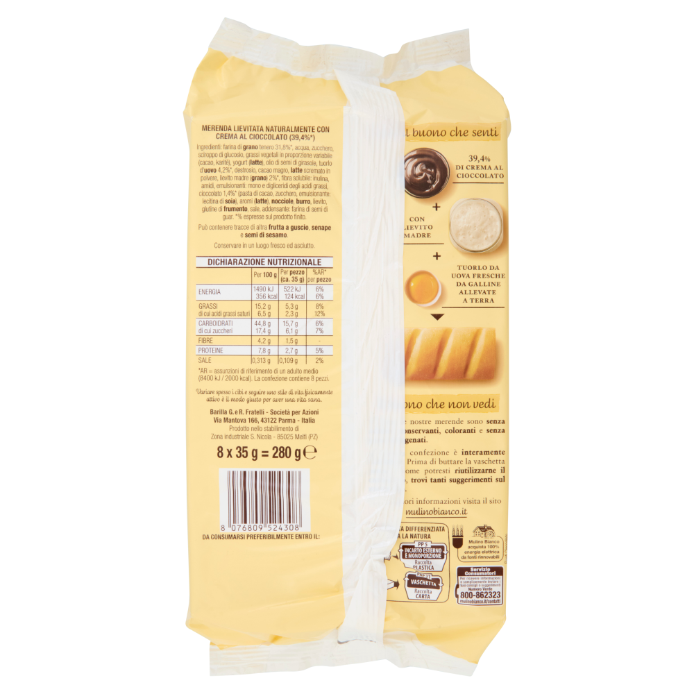 Tutto il buono che senti 39,4% di crema al cioccolato + Con lievito madre + Tuorlo da uova fresche da galline allevate a terra Il buono che non vedi - Tutte le nostre merende sono senza additivi conservanti, coloranti e senza grassi idrogenati. - Questa confezione è interamente riciclabile. Prima di buttare la vaschetta pensa a come potresti riutilizzarne il cartoncino, trovi tanti suggerimenti sul nostro sito. Variare spesso i cibi e seguire uno stile di vita fisicamente attivo è il modo giusto per aver una vita sana.