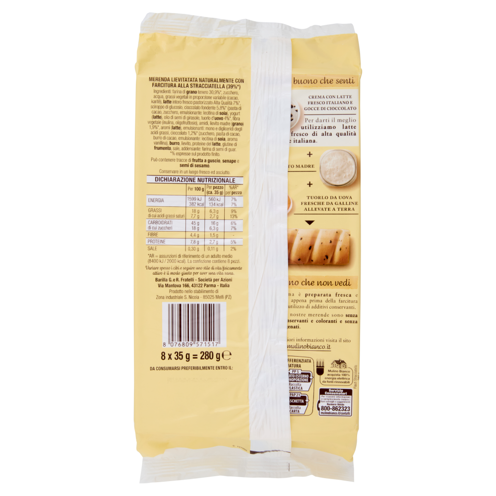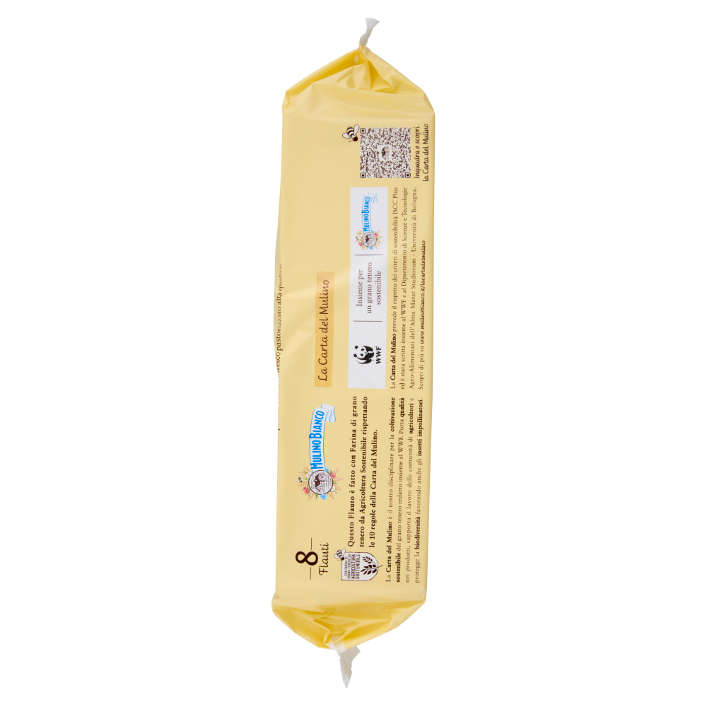 Tutto il buono che senti Crema con latte fresco italiano e gocce di cioccolato Per darti il meglio utilizziamo latte fresco di alta qualità di origine italiana. + Con lievito madre + Tuorlo da uova fresche da galline allevate a terra Il buono che non vedi - La crema è preparata fresca e pastorizzata appena prima della farcitura per evitare l'utilizzo di additivi conservanti. - Tutte le nostre merende sono senza additivi conservanti e coloranti e senza grassi idrogenati. Variare spesso i cibi e seguire uno stile di vita fisicamente attivo è il modo giusto per aver una vita sana. La Carta del Mulino Con farina di grano tenero da agricoltura sostenibile Questo Flauto è fatto con Farina di grano tenero da Agricoltura Sostenibile rispettando le 10 regole della Carta del Mulino. La Carta del Mulino è il nostro disciplinare per la coltivazione sostenibile del grano tenero redatto insieme al WWF. Porta qualità nei prodotti, supporta il lavoro delle comunità di agricoltori e protegge la biodiversità favorendo anche gli insetti impollinatori. Insieme per un grano tenero sostenibile La Carta del Mulino prevede il rispetto dei criteri di sostenibilità ISCC Plus ed è stata scritta insieme al WWF e al Dipartimento di Scienze e Tecnologie Agro-Alimentari dell'Alma Mater Studiorum - Università di Bologna. Scopri di più su www.mulinobianco.it/lacartadelmulino 1 Flauto Stracciatella (35 g) +1bicchiere di latte parzialmente scremato (200 ml) apportano circa 785 kJ / 188 kcal pari al 9% dell'assunzione di riferimento di un adulto medio (8400 kJ / 2000 kcal)