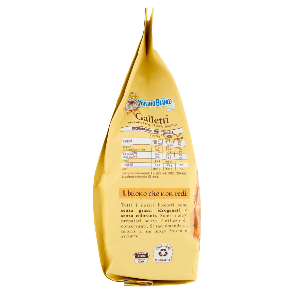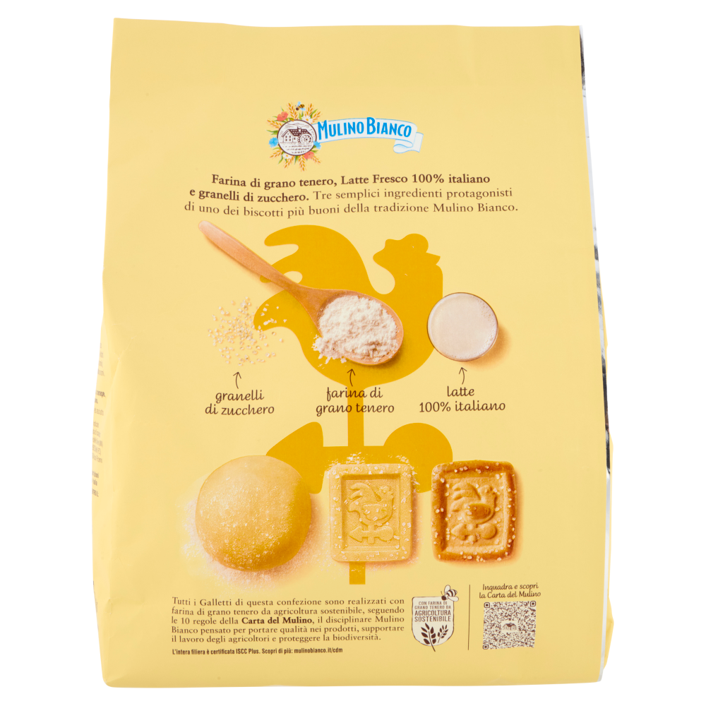 Farina di grano tenero, Latte Fresco 100% italiano e granelli di zucchero. Tre semplici ingredienti protagonisti di uno dei biscotti più buoni della tradizione Mulino Bianco. granelli di zucchero - farina di grano tenero - latte 100% italiano Con farina di grano tenero da agricoltura sostenibile Tutti i Galletti di questa confezione sono realizzati con farina di grano tenero da agricoltura sostenibile, seguendo le 10 regole della Carta del Mulino, il disciplinare Mulino Bianco pensato per portare qualità nei prodotti, supportare il lavoro degli agricoltori e proteggere la biodiversità. L'intera filiera è certificata ISCC Plus. Scopri di più: mulinobianco.it/cdm Il buono che non vedi Tutti i nostri biscotti sono senza grassi idrogenati e senza coloranti. Sono inoltre preparati senza l'utilizzo di conservanti. Si raccomanda di tenerli in un luogo fresco с asciutto.