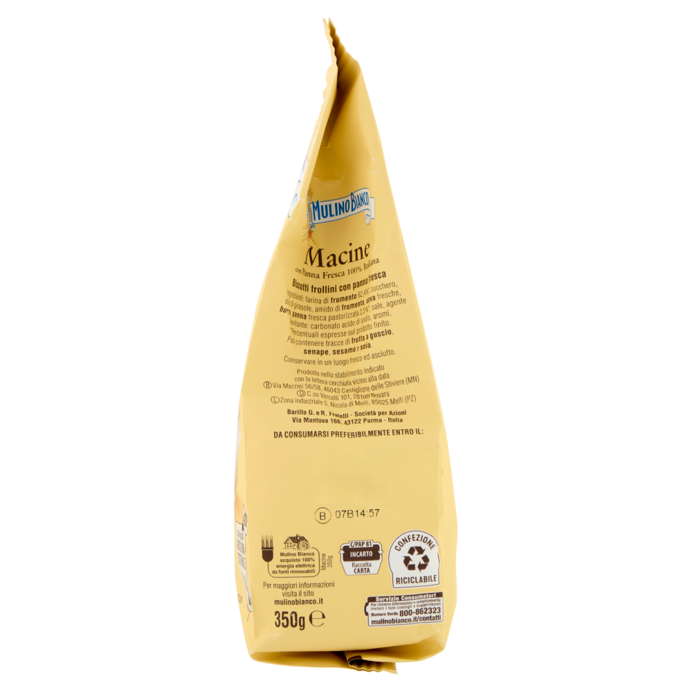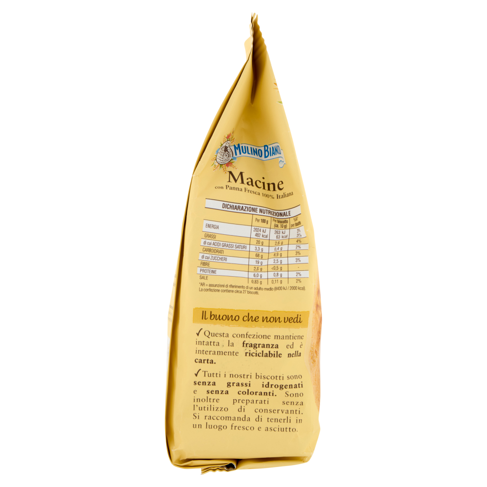 Le Macine del Mulino Una colazione all'insegna del gusto e dell'inzuppo perfetto, con uno dei biscotti più iconici di sempre, con panna da latte fresco 100% italiano. Per chi ama inzuppare, la colazione Mulino Bianco è firmata Macine. La Carta del Mulino Con farina da agricoltura sostenibile Ogni Macina di questa confezione è fatta con farina di grano tenero da Agricoltura Sostenibile rispettando le 10 regole della Carta del Mulino. La Carta del Mulino è il nostro disciplinare per la coltivazione sostenibile del grano tenero redatto insieme al WWF. Porta qualità nei prodotti, supporta il lavoro della comunità di agricoltori e protegge la biodiversità favorendo anche gli insetti impollinatori. Insieme per un grano tenero sostenibile La Carta del Mulino prevede il rispetto dei criteri di sostenibilità ISCC Plus ed è stata scritta insieme al WWF e al Dipartimento di Scienze e Tecnologie Agro-Alimentari dell'Alma Mater Studiorum - Università di Bologna. Scopri di più su mulinobianco.it/lacartadelmulino Il buono che non vedi - Questa confezione mantiene intatta, la fragranza ed è interamente riciclabile nella carta. - Tutti i nostri biscotti sono senza grassi idrogenati e senza coloranti. Sono inoltre preparati senza l'utilizzo di conservanti. Si raccomanda di tenerli in un luogo fresco e asciutto.