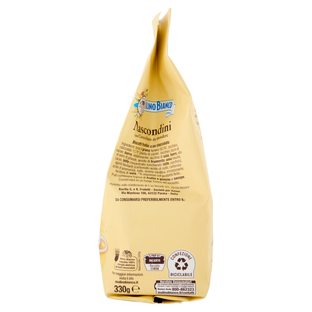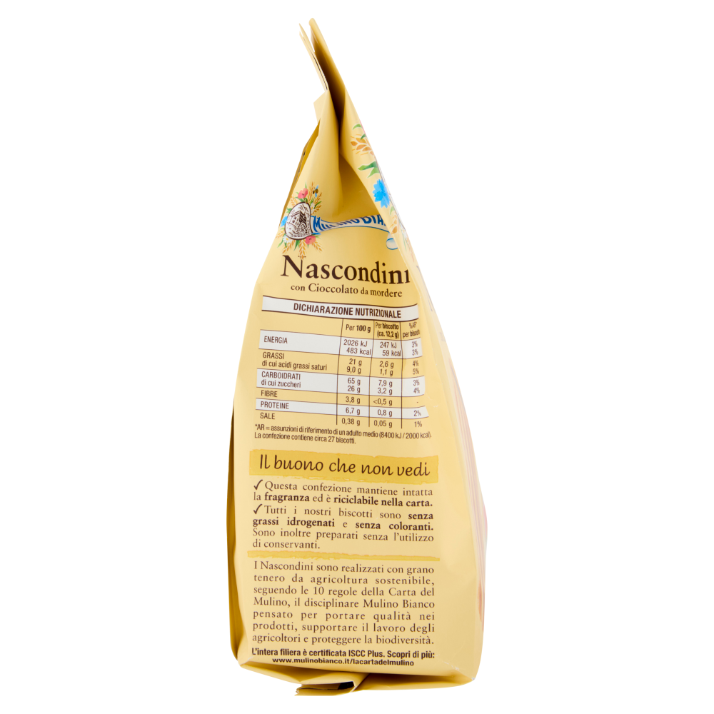 Il buono che non vedi - Questa confezione mantiene intatta la fragranza ed è riciclabile nella carta. - Tutti i nostri biscotti sono senza grassi idrogenati e senza coloranti. Sono inoltre preparati senza l'utilizzo di conservanti. I Nascondini sono realizzati con grano tenero da agricoltura sostenibile, seguendo le 10 regole della Carta del Mulino, il disciplinare Mulino Bianco pensato per portare qualità nei prodotti, supportare il lavoro degli agricoltori e proteggere la biodiversità. L'intera filiera è certificata ISCC Plus. Scopri di più: www.mulinobianco.it/lacartadelmulino