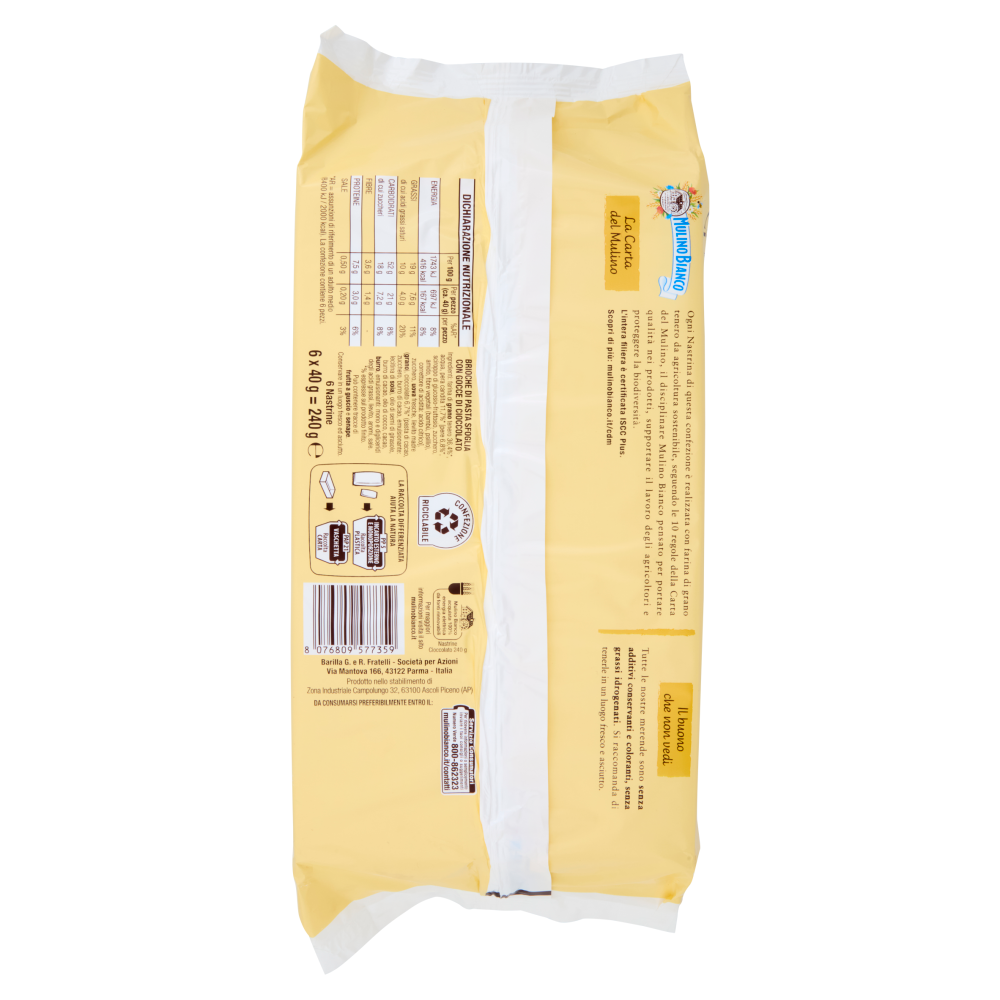 La Carta del Mulino Ogni Nastrina di questa confezione è realizzata con farina di grano tenero da agricoltura sostenibile, seguendo le 10 regole della Carta del Mulino, il disciplinare Mulino Bianco pensato per portare qualità nei prodotti, supportare il lavoro degli agricoltori e proteggere la biodiversità. L'intera filiera è certificata ISCC Plus. Scopri di più: mulinobianco.it/cdm Il buono che non vedi Tutte le nostre merende sono senza additivi conservanti e coloranti, senza grassi idrogenati. Si raccomanda di tenerle in un luogo fresco e asciutto.