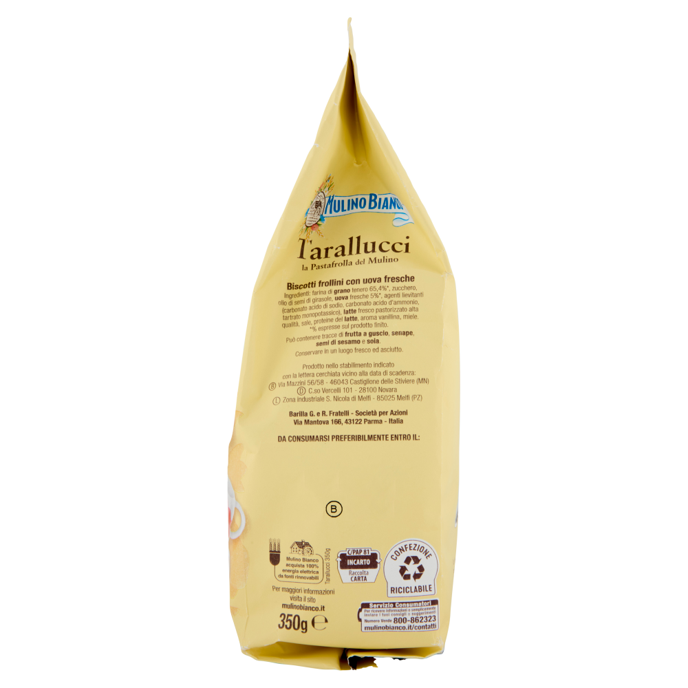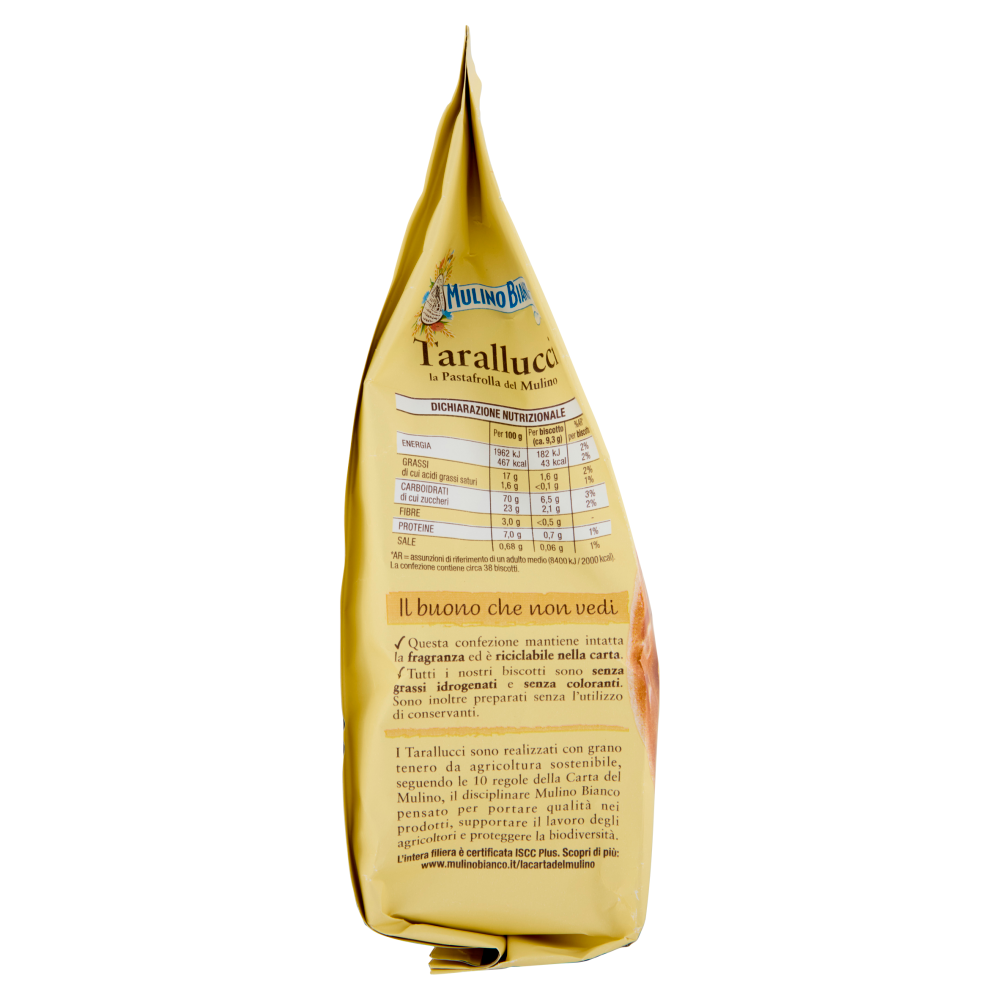 Il buono che non vedi - Questa confezione mantiene intatta la fragranza ed è riciclabile nella carta. - Tutti i nostri biscotti sono senza grassi idrogenati e senza coloranti. Sono inoltre preparati senza l'utilizzo di conservanti. I Tarallucci sono realizzati con grano tenero da agricoltura sostenibile, seguendo le 10 regole della Carta del Mulino, il disciplinare Mulino Bianco pensato per portare qualità nei prodotti, supportare il lavoro degli agricoltori e proteggere la biodiversità. L'intera filiera è certificata ISCC Plus. Scopri di più: www.mulinobianco.it/lacartadelmulino