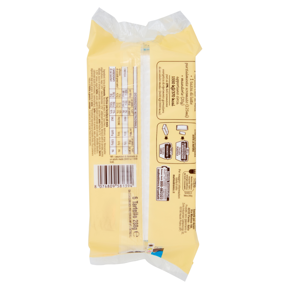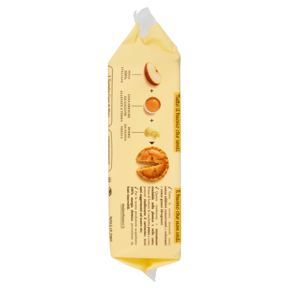 1 Tartella Cuor di Mela + 1 tazza di latte parzialmente scremato (125ml) + mandorle (20g) apportano circa 1550 kJ/370 kcal pari al 19% dell'assunzione energetica di riferimento giornaliera di un adulto medio (8400 kJ/2000 kcal). Tutto il buono che senti Mele 100% italiane + Uova fresche da galline allevate a terra + Burro da panna fresca Il buono che non vedi - Tutte le nostre merende sono senza additivi conservanti e coloranti e senza grassi idrogenati. - Questa confezione è interamente riciclabile nella plastica e nella carta. Prima di buttare la vaschetta pensa a come potresti riutilizzarne il cartoncino, trovi tanti suggerimenti sul nostro sito. - Per la nostra produzione acquistiamo 100% energia elettrica proveniente da fonti rinnovabili. mulinobianco.it