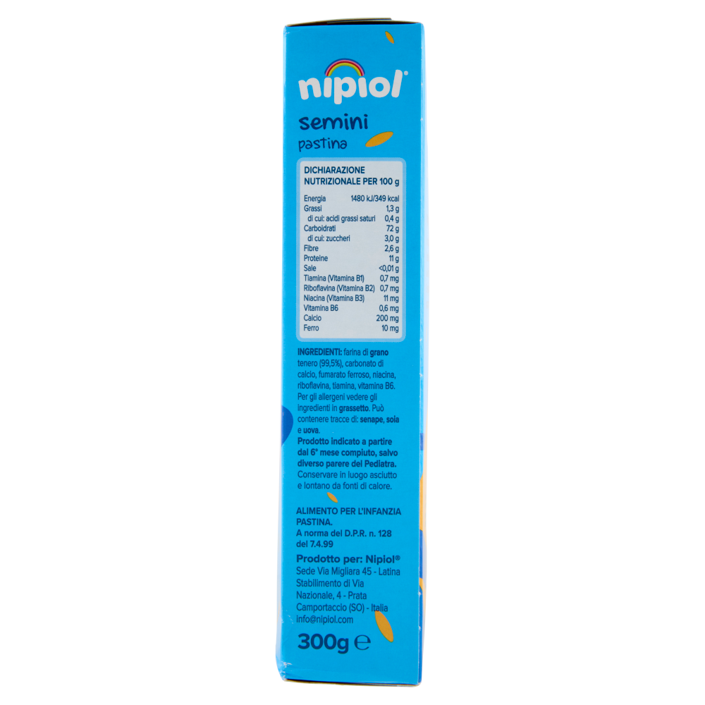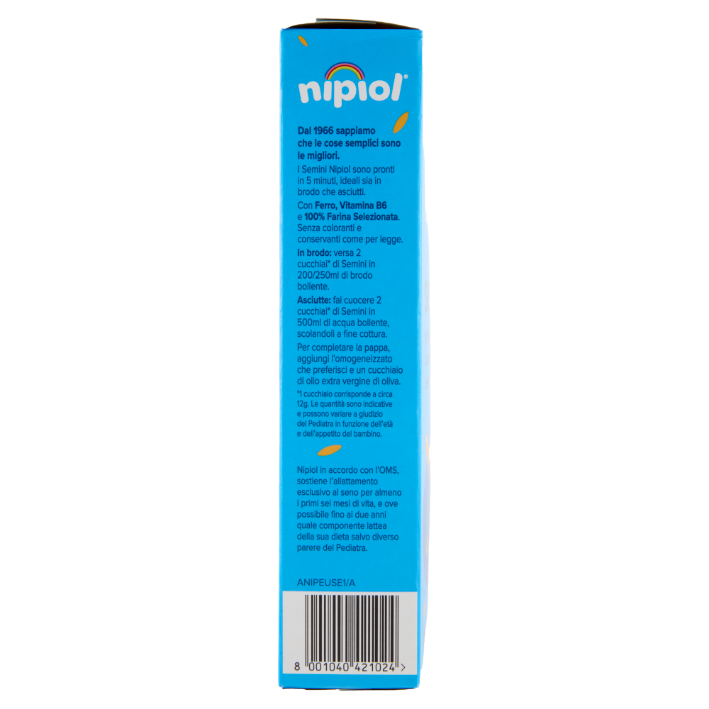 Ogni pappa è una storia Un piccolo passo per l'uomo... un grande passo per la pappa. I nostri piccoli Space Ranger sono pronti a compiere una delle loro più importanti missioni: diventare grandi. E viaggiando con la fantasia, possono vivere l'ora della pappa come se fosse un'avventura fantastica. Dal 1966 sappiamo che le cose semplici sono le migliori. I Semini Nipiol sono pronti in 5 minuti, ideali sia in brodo che asciutti. Con Ferro, Vitamina B6 e 100% Farina Selezionata. Senza coloranti e conservanti come per legge.