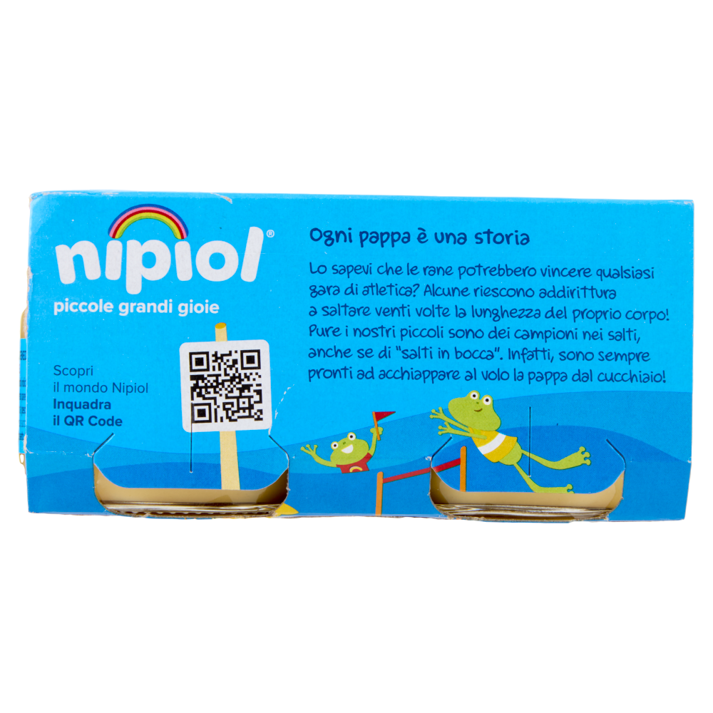 Ogni pappa è una storia Lo sapevi che le rane potrebbero vincere qualsiasi gara di atletica? Alcune riescono addirittura a saltare venti volte la lunghezza del proprio corpo! Pure i nostri piccoli sono dei campioni nei salti, anche se di "salti in bocca". Infatti, sono sempre pronti ad acchiappare al volo la pappa dal cucchiaio! Dal 1966 sappiamo che le cose semplici sono le migliori. Gusta l'omogeneizzato Nipiol con 100% pesce selezionato da filiera controllata come base per la pappa. Inoltre: senza sale aggiunto - senza glutine - senza coloranti* e conservanti*. Preparazione semplice e veloce. Scalda il vasetto aperto a bagnomaria e mescola fino a raggiungere la consistenza desiderata. Infine aggiungilo nella pappa. *come per legge