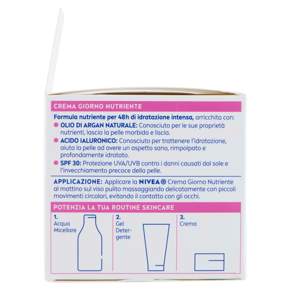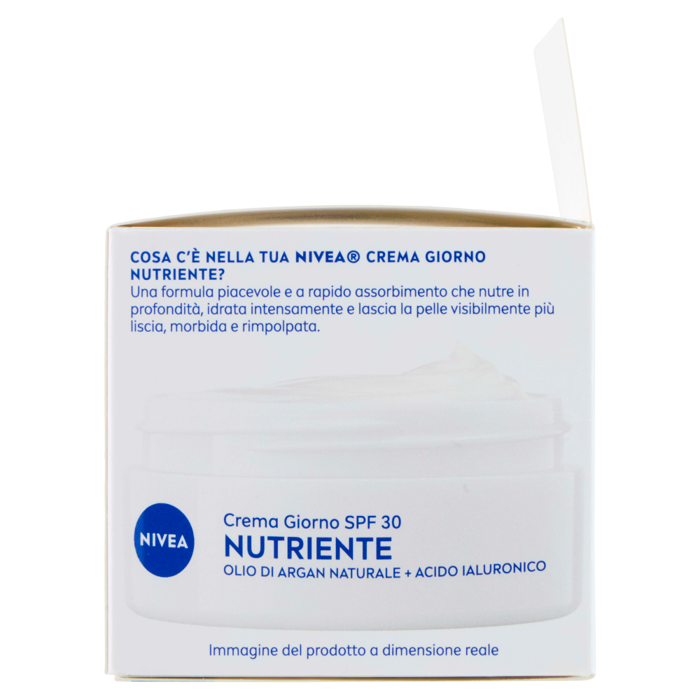 Risultati provati Dopo il 1° utilizzo - Nutre in profondità e rimpolpa la pelle con un'idratazione duratura, proteggendola dagli agenti esterni grazie all'SPF 30. Con utilizzo regolare - Rafforza la barriera cutanea, mantenendo la pelle intensamente idratata, nutrita e levigata. 92% - conferma una sensazione di pelle extra morbida** **Autovalutazione, studio di 2 settimane, 110 donne Crema giorno nutriente Formula nutriente per 48h di idratazione intensa, arricchita con: - Olio di argan naturale: Conosciuto per le sue proprietà nutrienti, lascia la pelle morbida e liscia. - Acido ialuronico: Conosciuto per trattenere l'idratazione, aiuta la pelle ad avere un aspetto sano, rimpolpato e profondamente idratato. - SPF 30: Protezione UVA/UVB contro i danni causati dal sole e l'invecchiamento precoce della pelle. Cosa c'è nella tua Nivea crema giorno nutriente? Una formula piacevole e a rapido assorbimento che nutre in profondità, idrata intensamente e lascia la pelle visibilmente più liscia, morbida e rimpolpata.