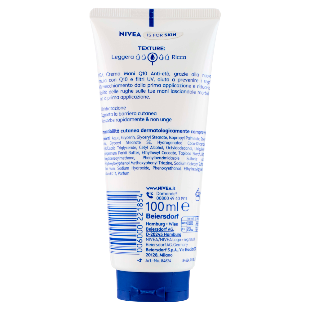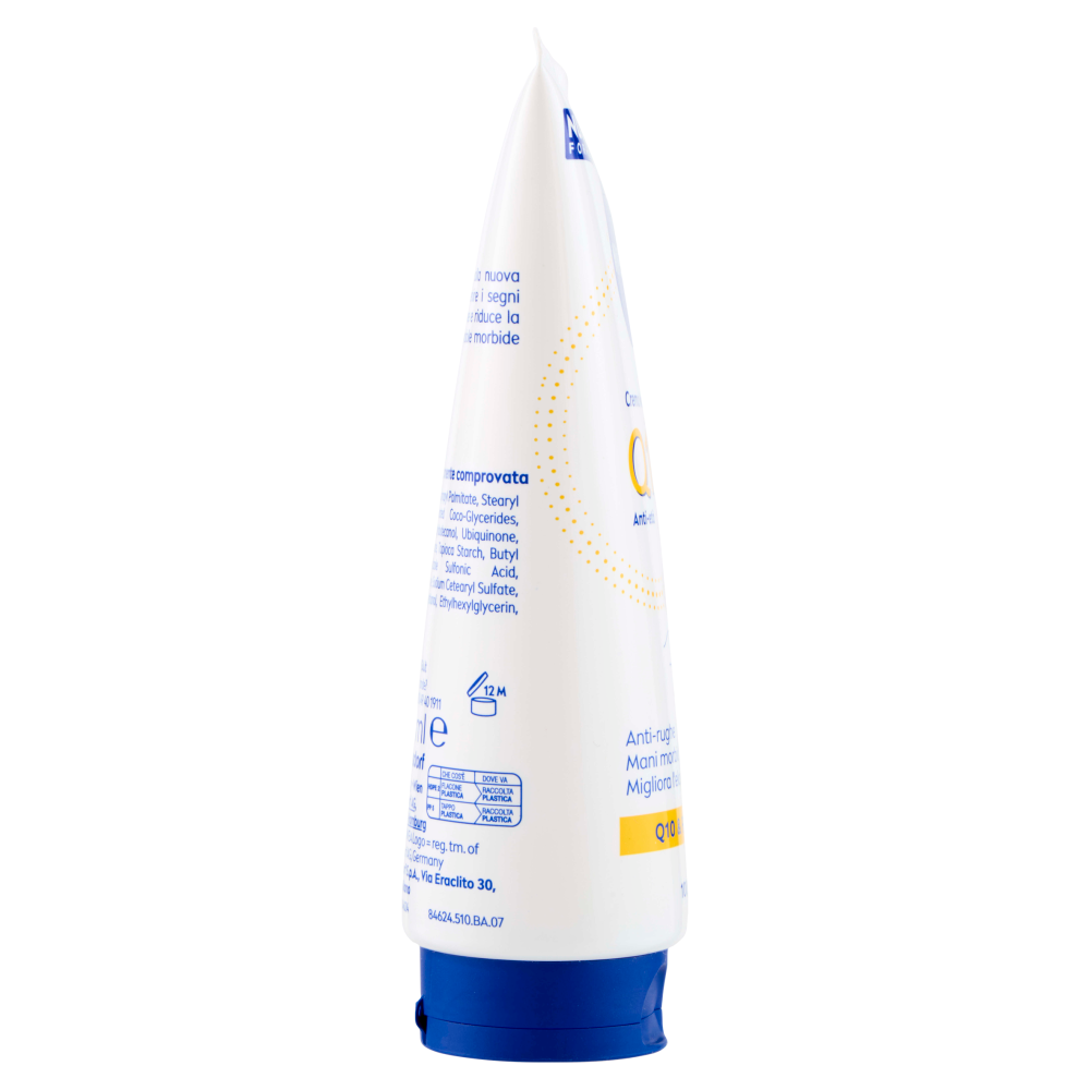 Nivea Crema Mani Q10 Anti-età, grazie alla nuova formula con Q10 e filtri UV, aiuta a prevenire i segni dell'invecchiamento dalla prima applicazione e riduce la visibilità delle rughe sulle tue mani lasciandole morbide dopo la prima applicazione. - 48h idratazione - Supporta la barriera cutanea - Si assorbe rapidamente & non unge Compatibilità cutanea dermatologicamente comprovata