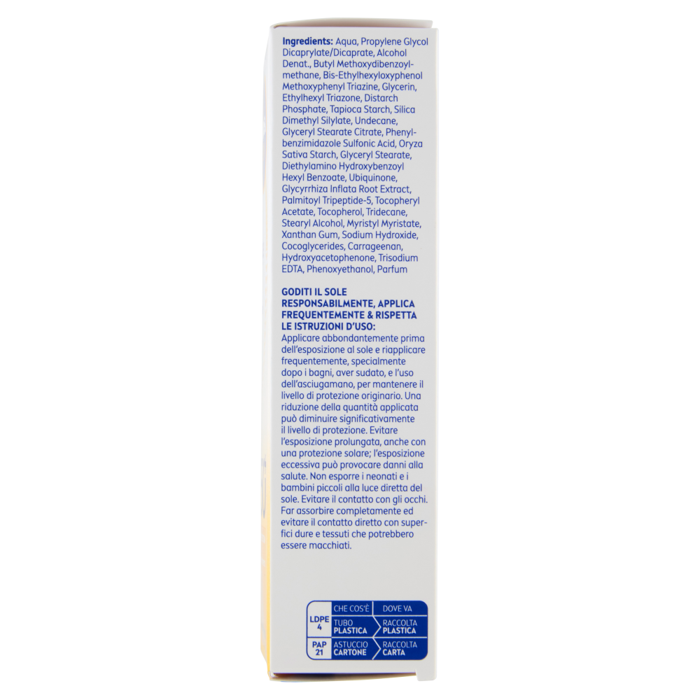 Goditi il sole responsabilmente, applica frequentemente & rispetta le istruzioni d'uso: Applicare abbondantemente prima dell'esposizione al sole e riapplicare frequentemente, specialmente dopo i bagni, aver sudato, e l'uso dell'asciugamano, per mantenere il livello di protezione originario. Una riduzione della quantità applicata può diminuire significativamente il livello di protezione. Evitare l'esposizione prolungata, anche con una protezione solare; l'esposizione eccessiva può provocare danni alla salute. Non esporre i neonati e i bambini piccoli alla luce diretta del sole. Evitare il contatto con gli occhi. Far assorbire completamente ed evitare il contatto diretto con superfici dure e tessuti che potrebbero essere macchiati.