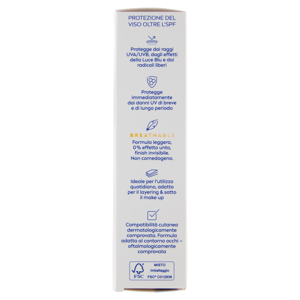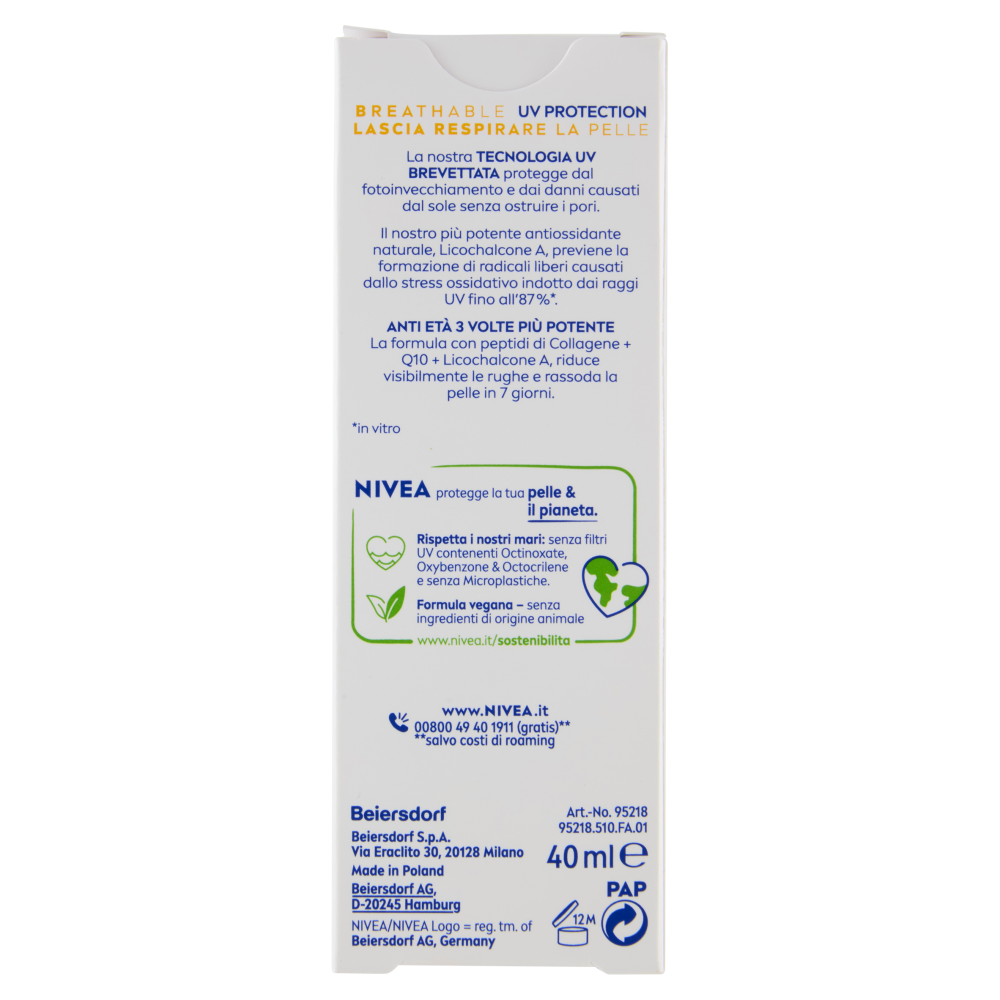 Breathable UV protection Lascia respirare la pelle La nostra Tecnologia UV Brevettata protegge dal fotoinvecchiamento e dai danni causati dal sole senza ostruire i pori. Il nostro più potente antiossidante naturale, Licochalcone A, previene la formazione di radicali liberi causati dallo stress ossidativo indotto dai raggi UV fino all'87%*. *in vitro Anti età 3 volte più potente La formula con peptidi di Collagene + Q10 + Licochalcone A, riduce visibilmente le rughe e rassoda la pelle in 7 giorni. Nivea protegge la tua pelle & il pianeta Rispetta i nostri mari: senza filtri UV contenenti Octinoxate, Oxybenzone & Octocrilene e senza Microplastiche. Formula vegana - senza ingredienti di origine animale www.nivea.it/sostenibilita Protezione del viso oltre l'SPF - Protegge dai raggi UVA/UVB, dagli effetti della Luce Blu e dai radicali liberi - Protegge immediatamente dai danni UV di breve e di lungo periodo Breathable - Formula leggera, 0% effetto unto, finish invisibile. Non comedogeno. - Ideale per l'utilizzo quotidiano, adatto per il layering & sotto il make up - Compatibilità cutanea dermatologicamente comprovata. Formula adatta al contorno occhi - oftalmologicamente comprovata