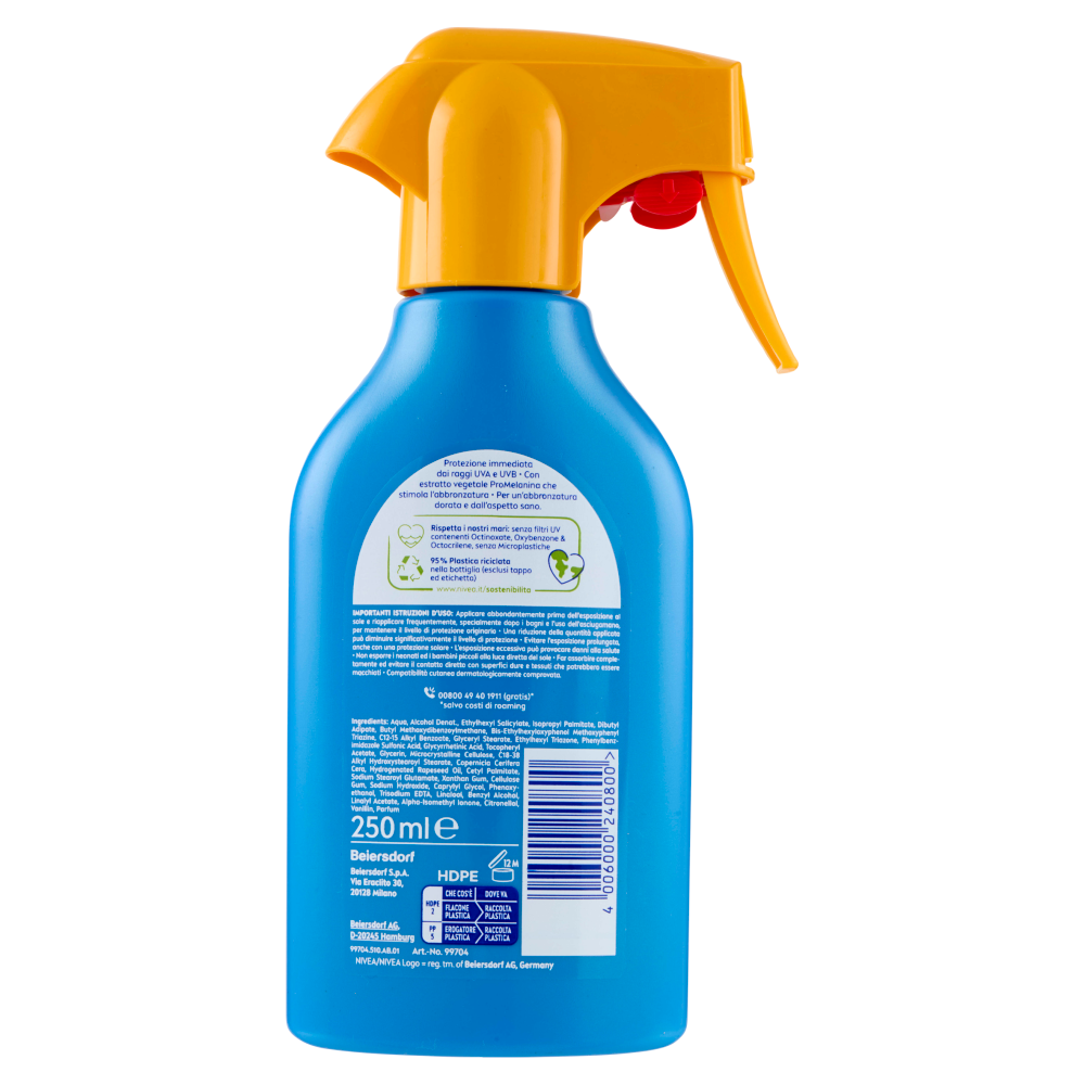 Protezione immediata dai raggi UVA e UVB. - Con estratto vegetale ProMelanina che stimola l'abbronzatura. - Per un'abbronzatura dorata e dall'aspetto sano. - Rispetta i nostri mari: senza filtri UV contenenti Octinoxate, Oxybenzone & Octocrilene, senza Microplastiche - 95% Plastica riciclata nella bottiglia (esclusi tappo ed etichetta) www.nivea.it/sostenibilita