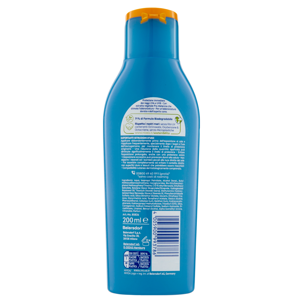 - Protezione immediata dai raggi UVA e UVB - Con estratto vegetale Pro-Melanina che stimola l'abbronzatura - Per un'abbronzatura dorata e dall'aspetto sano. 71 % di Formula Biodegradabile Rispetta i nostri mari: senza filtri UV contenenti Octinoxate, Oxybenzone & Octocrilene, senza Microplastiche www.nivea.it/sostenibilita