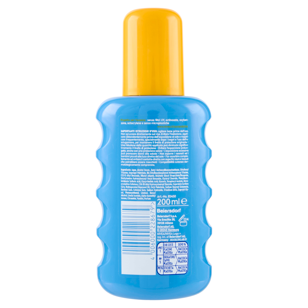 Importanti istruzioni d'uso: Agitare bene prima dell'uso. Non spruzzare direttamente sul viso. Evitare l'inalazione. Applicare abbondantemente prima dell'esposizione al sole e riapplicare frequentemente, specialmente dopo i bagni e l'uso dell'asciugamano, per mantenere il livello di protezione originario - Una riduzione della quantità applicata può diminuire significativamente il livello di protezione - Evitare l'esposizione prolungata, anche con una protezione solare - L'esposizione eccessiva può provocare danni alla salute - Non esporre i neonati ed i bambini piccoli alla luce diretta del sole - Far assorbire completamente ed evitare il contatto diretto con superfici dure e tessuti che potrebbero essere macchiati - Compatibilità cutanea dermatologicamente comprovata.