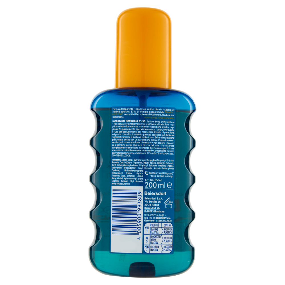 Formula trasparente - Non lascia residui bianchi - Adatta per l'attività sportiva. 83% di formule biodegradabile. Rispetta i nostri mari: senza filtri UV contenenti Octinoxate e Oxybenzone. Octocrilene. www.nivea.it/sostenibilita
