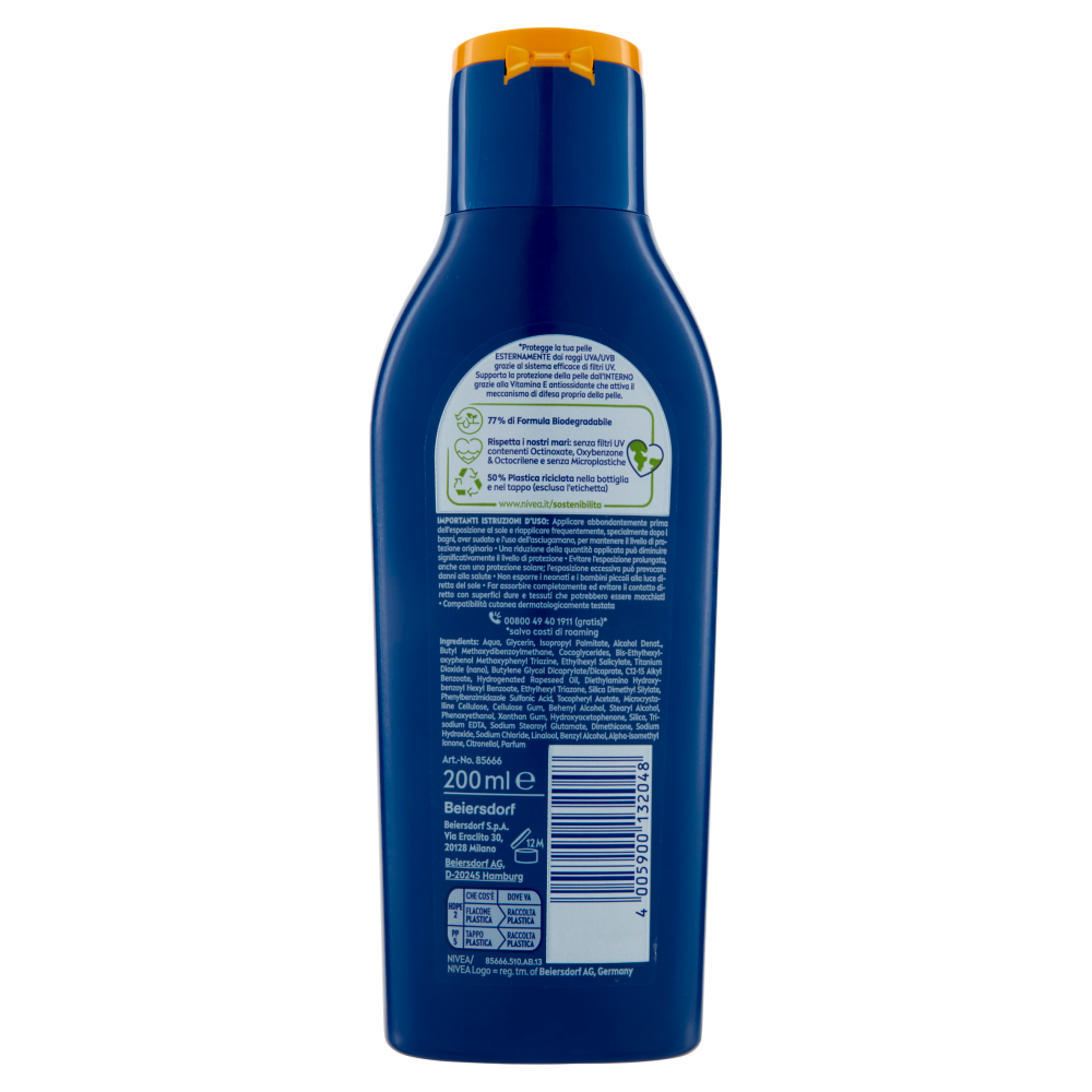 77 % di Formula Biodegradabile Rispetta i nostri mari: senza filtri UV contenenti Octinoxate, Oxybenzone & Octocrilene e senza Microplastiche 50 % Plastica riciclata nella bottiglia e nel tappo (esclusa l'etichetta) www.nivea.it/sostenibilita
