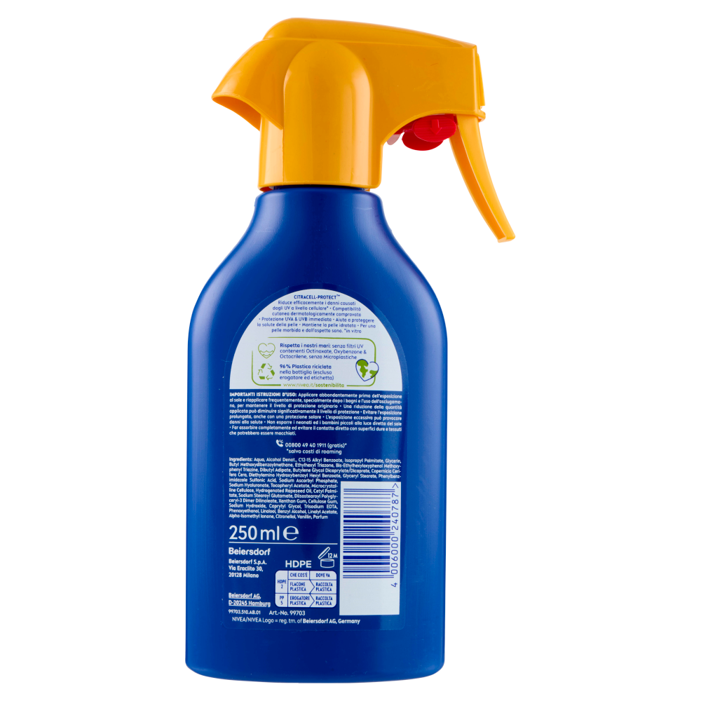 Citracell-Protect Riduce efficacemente i danni causati dagli UV a livello cellulare* - Compatibilità cutanea dermatologicamente comprovata - Protezione UVA & UVB immediata. - Aiuta a proteggere la salute della pelle - Mantiene la pelle idratata. - Per una pelle morbida e dall'aspetto sano. *in vitro - Rispetta i nostri mari: senza filtri UV contenenti Octinoxate, Oxybenzone & Octocrilene, senza Microplastiche - 96% Plastica riciclata nella bottiglia (escluso erogatore ed etichetta) www.nivea.it/sostenibilita