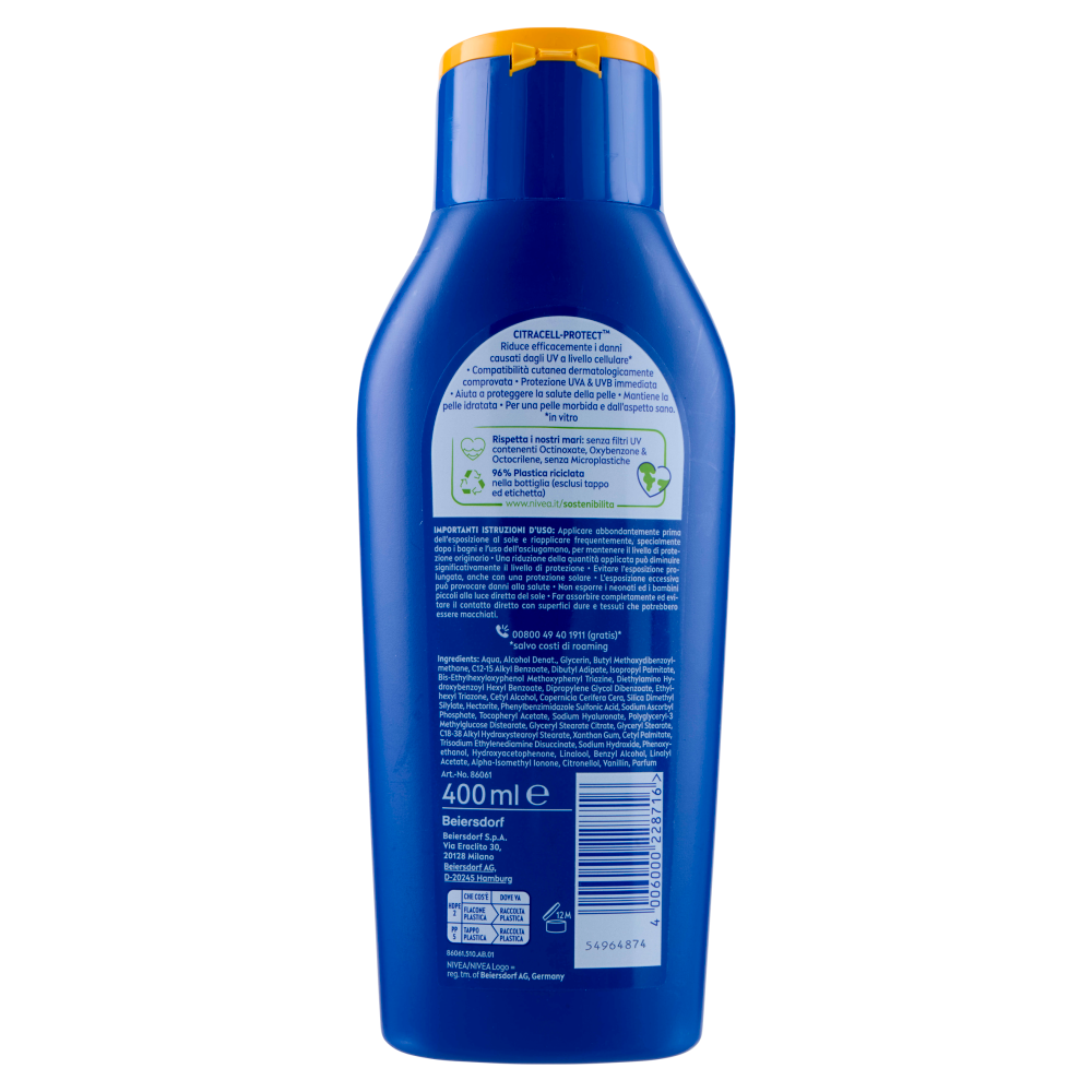 Citracell-Protect Riduce efficacemente i danni causati dagli UV a livello cellulare* - Compatibilità cutanea dermatologicamente comprovata - Protezione UVA & UVB immediata - Aiuta a proteggere la salute della pelle - Mantiene la pelle idratata - Per una pelle morbida e dall'aspetto sano. *in vitro - Rispetta i nostri mari: senza filtri UV contenenti Octinoxate, Oxybenzone & Octocrylene, senza Microplastiche - 96% Plastica riciclata nella bottiglia (esclusi tappo ed etichetta) www.nivea.it/sostenibilita