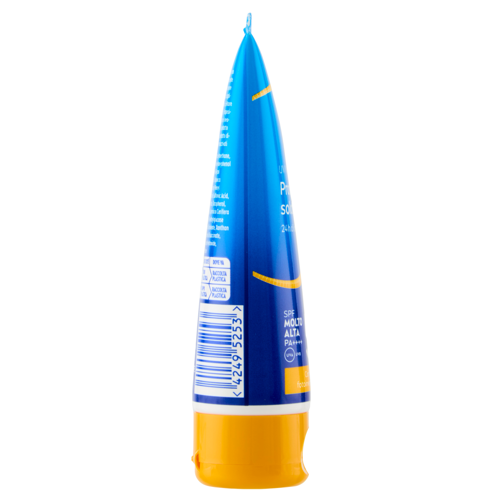 Tecnologia UV brevettata. Protezione immediata. Si assorbe in pochi secondi. Adatto a pelli sensibili.