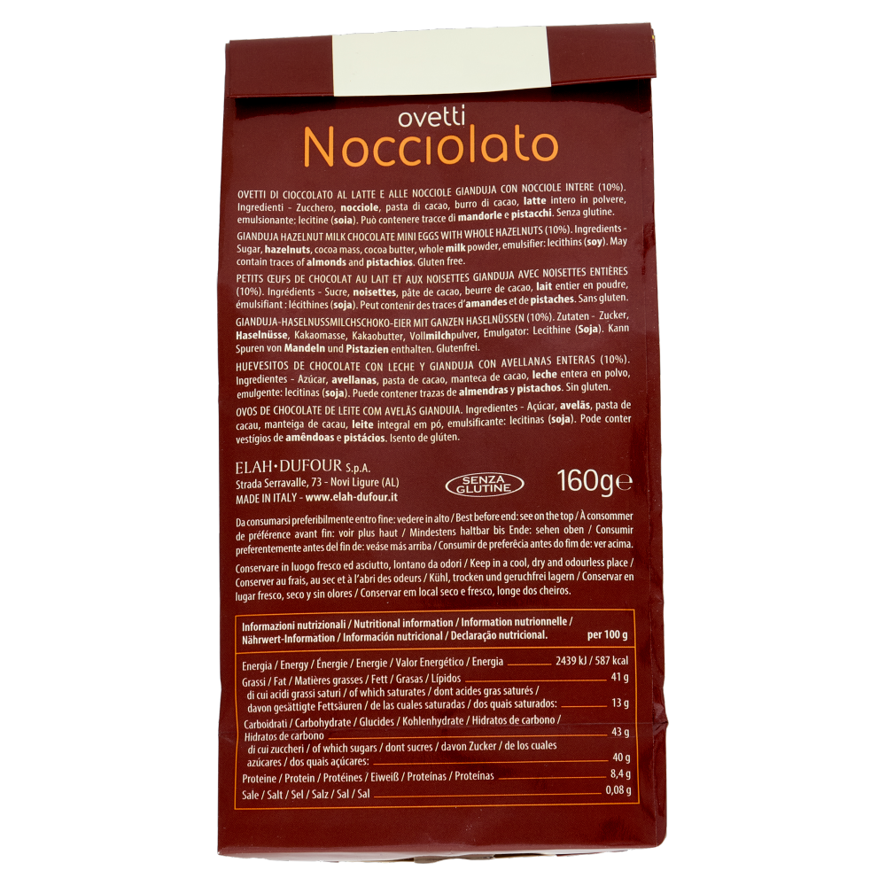 Senza glutineOvetti di cioccolato al latte e alle nocciole gianduja con nocciole intere (10%)