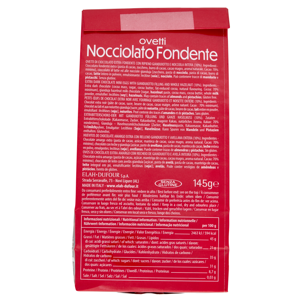 Senza glutineOvetti di cioccolato extra fondente con ripieno gianduiotto e nocciola intera (10%)