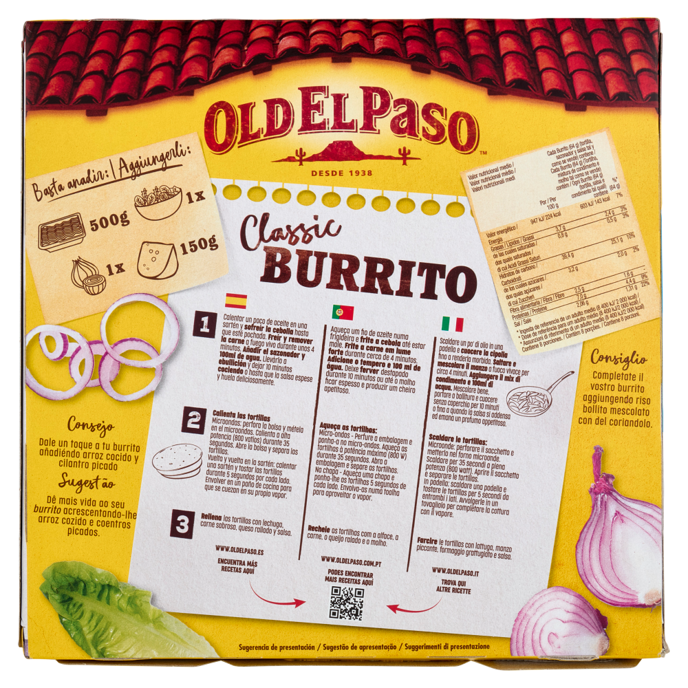 Tempo di preparazione - 15 Min Scaldare un po' di olio in una padella e cuocere la cipolla fino a renderla morbida. Saltare e mescolare il manzo a fuoco vivace per circa 4 minuti. Aggiungere il mix di condimento e 100ml di acqua. Mescolare bene, portare a bollitura e cuocere senza coperchio per 10 minuti o fina a quando la salsa si addensa ed emana un profumo appetitoso. Scaldare le tortillas: Microonde: perforare il sacchetto e metterlo nel forno microonde. Scaldare per 35 secondi a piena potenza (800 watt). Aprire il sacchetto e separare le tortillas. In padella: scaldare una padella e tostare le tortillas per 5 secondi da entrambi i lati. Avvolgerle in un tovagliolo per completare la cottura con il vapore. Farcire le tortillas con lattuga, manzo piccante, formaggio grattugiato e salsa. Consiglio Completate il vostro burrito aggiungendo riso bollito mescolato con del coriandolo.