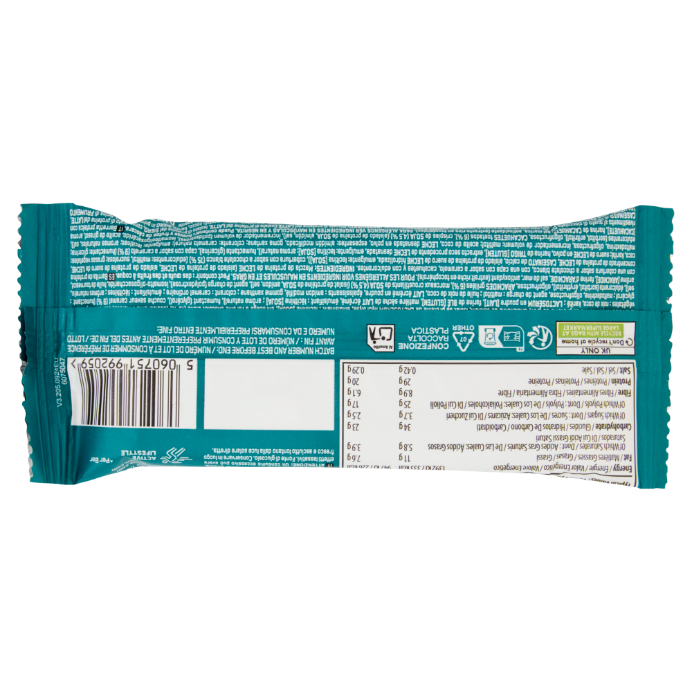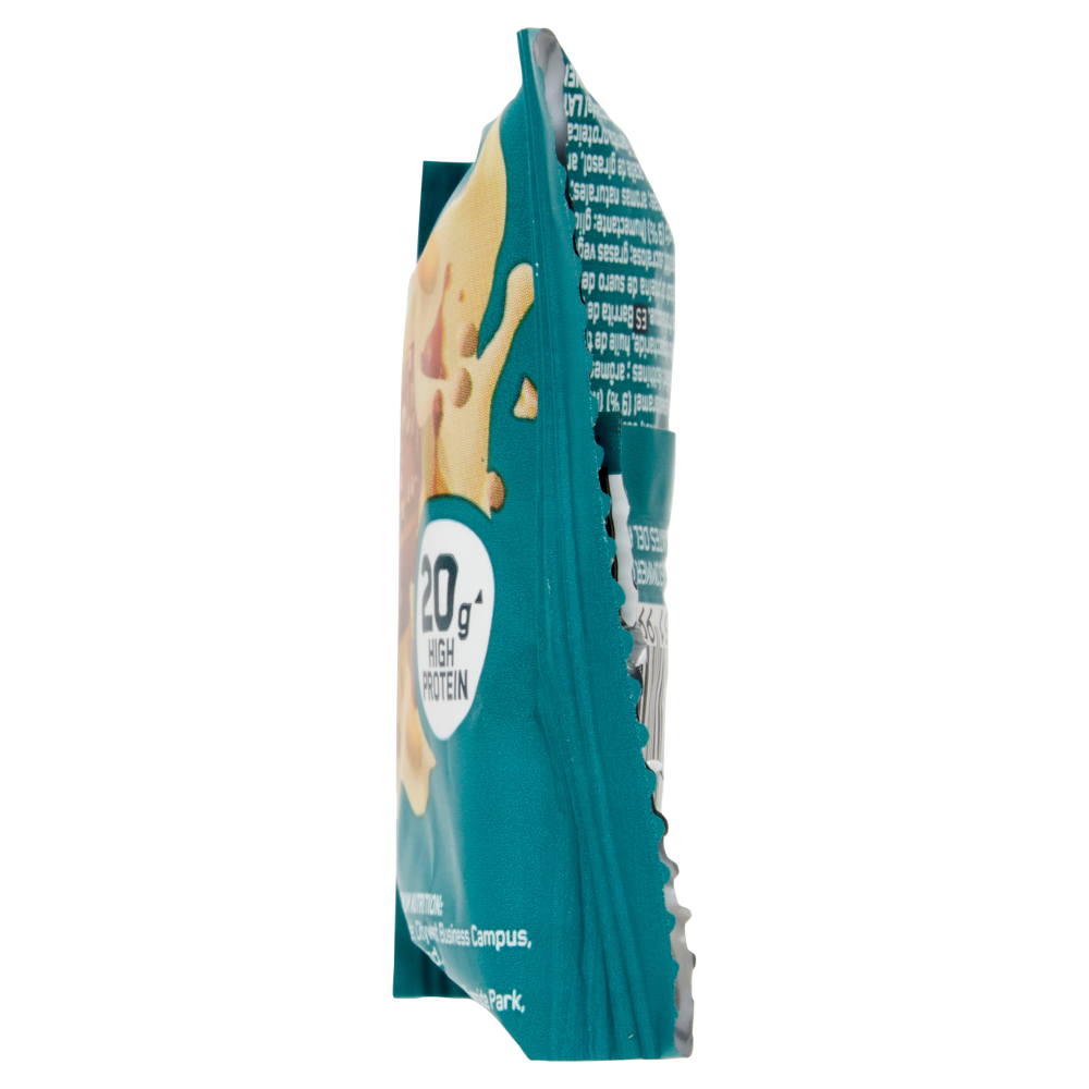 Barretta proteica con rivestimento al gusto di cioccolato bianco, con uno strato al gusto di caramello, arachidi e con edulcoranti