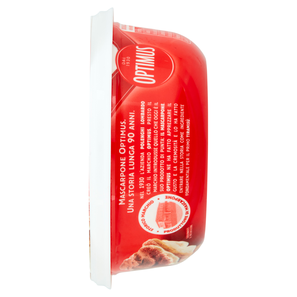 Optimus Dal 1930 Mascarpone Optimus. Una storia lunga 90 anni. Nel 1930 l'azienda Polenghi Lombardo creò il marchio Optimus. Presto il marchio introdusse quello che oggi è il suo prodotto di punta: il mascarpone. Optimus ne ha fatto apprezzare il gusto e la cremosità e lo ha fatto entrare nella storia come ingrediente fondamentale per il primo tiramisù. Storico marchio - Produttore di mascarpone