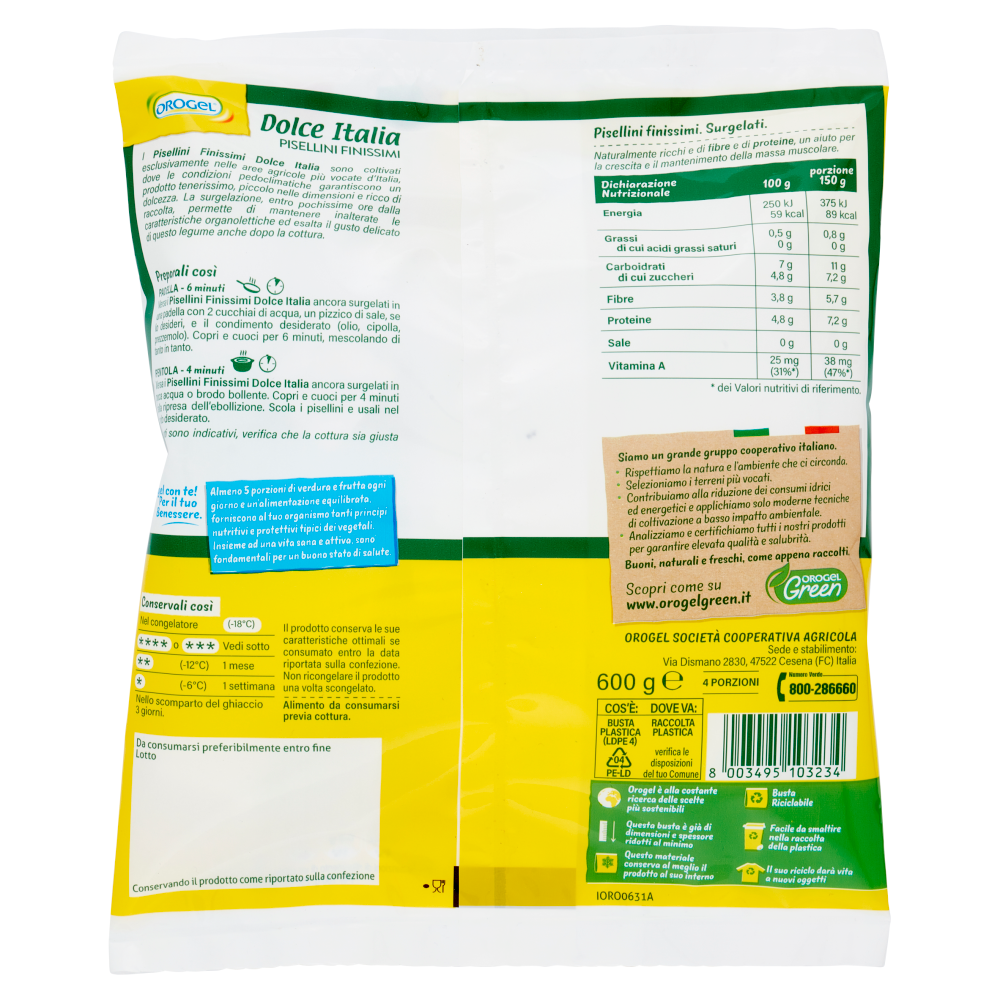 I Pisellini Finissimi Dolce Italia sono coltivati esclusivamente nelle aree agricole più vocate d'Italia, dove le condizioni pedoclimatiche garantiscono un prodotto tenerissimo, piccolo nelle dimensioni e ricco di dolcezza. La surgelazione, entro pochissime ore dalla raccolta, permette di mantenere inalterate le caratteristiche organolettiche ed esalta il gusto delicato di questo legume anche dopo la cottura. Naturalmente ricchi e di fibre e di proteine, un aiuto per la crescita e il mantenimento della massa muscolare. Orogel con te! Per il tuo Benessere. Almeno 5 porzioni di verdura e frutta ogni giorno e un'alimentazione equilibrata, forniscono al tuo organismo tanti principi nutritivi e protettivi tipici dei vegetali. Insieme ad una vita sana e attiva, sono fondamentali per un buono stato di salute. Orogel è alla costante ricerca delle scelte più sostenibili Questa busta è già di dimensioni e spessore ridotti al minimo Questo materiale conserva al meglio il prodotto al suo interno Busta Riciclabile Facile da smaltire nella raccolta della plastica Il suo riciclo darà vita a nuovi oggetti