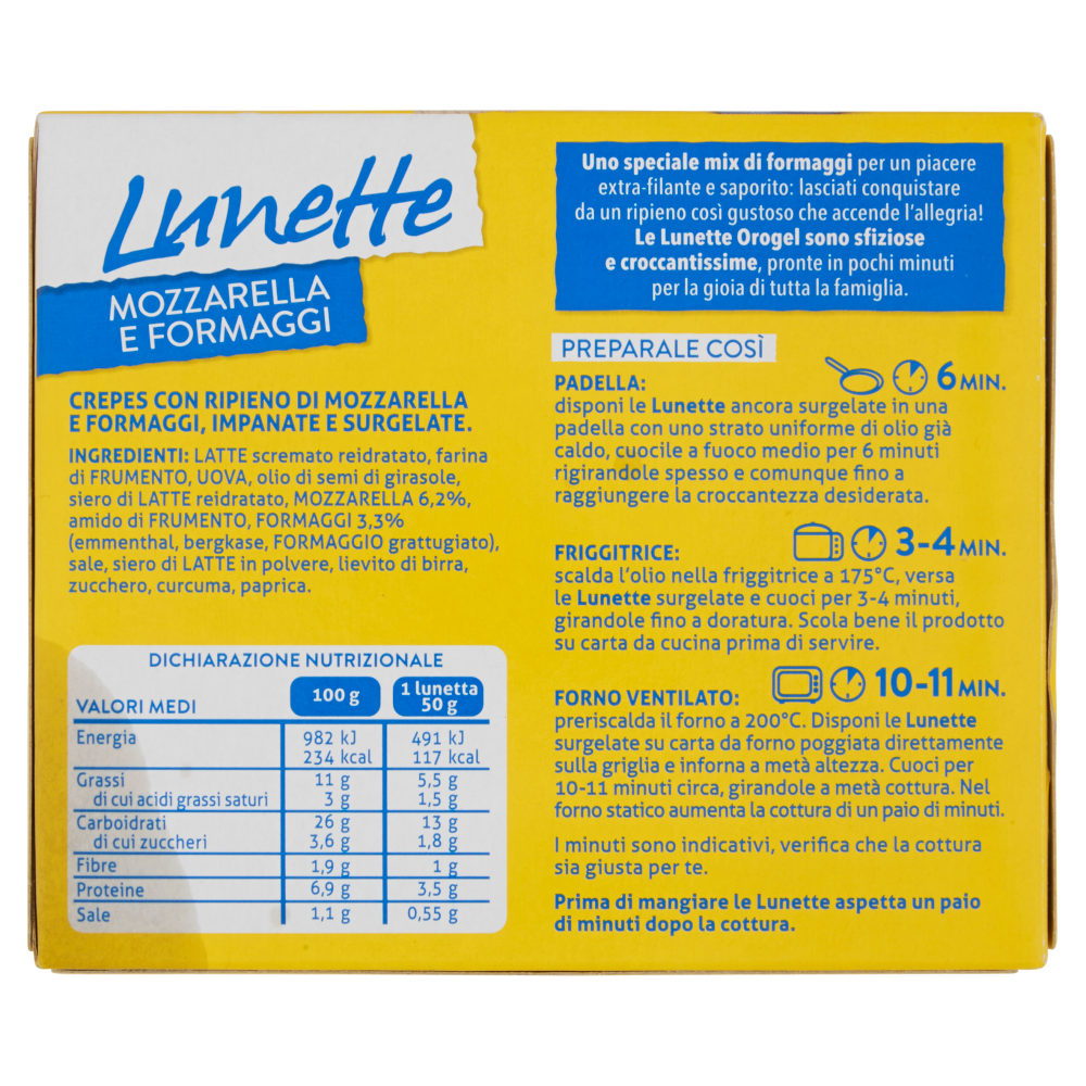 Uno speciale mix di formaggi per un piacere extra-filante e saporito: lasciati conquistare da un ripieno così gustoso che accende l'allegria! Le Lunette Orogel sono sfiziose e croccantissime, pronte in pochi minuti per la gioia di tutta la famiglia.