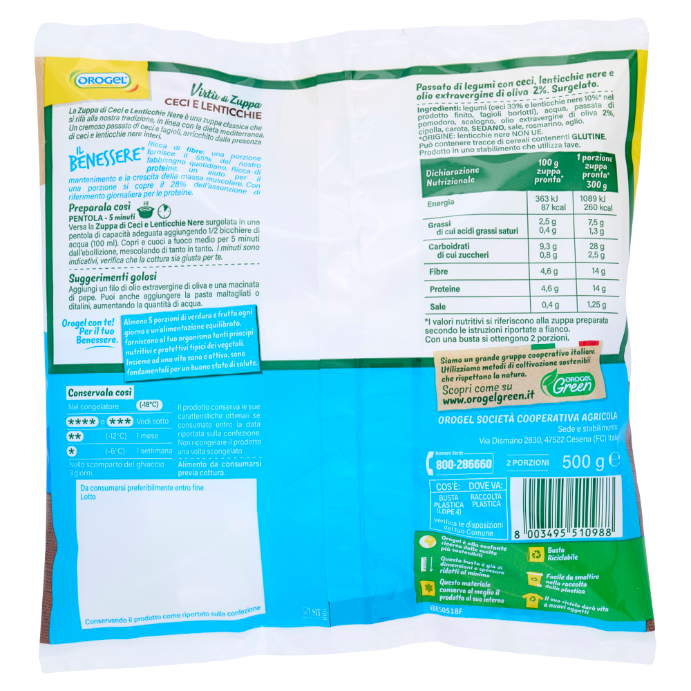 La Zuppa di Ceci e Lenticchie Nere è una zuppa classica che si rifà alla nostra tradizione, in linea con la dieta mediterranea. Un cremoso passato di ceci e fagioli, arricchito dalla presenza di ceci e lenticchie nere interi. Il Benessere Ricca di fibre: una porzione fornisce il 55% del nostro fabbisogno quotidiano. Ricca di proteine, un aiuto per il mantenimento e la crescita della massa muscolare. Con una porzione si copre il 28% dell'assunzione di riferimento giornaliera per le proteine. Orogel con te! Per il tuo Benessere. Almeno 5 porzioni di verdura e frutta ogni giorno e un'alimentazione equilibrata, forniscono al tuo organismo tanti principi nutritivi e protettivi tipici dei vegetali. Insieme ad una vita sana e attiva, sono fondamentali per un buono stato di salute. Orogel è alla costante ricerca delle scelte più sostenibili Questa busta è già di dimensioni e spessore ridotti al minimo Questo materiale conserva al meglio il prodotto al suo interno Busta Riciclabile Facile da smaltire nella raccolta della plastica Il suo riciclo darà vita a nuovi oggetti