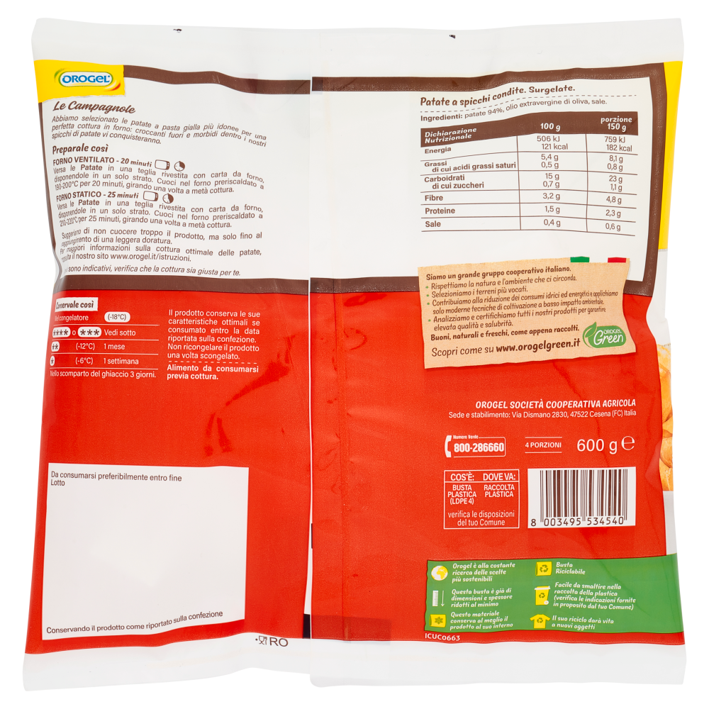 Abbiamo selezionato le patate a pasta gialla più idonee per una perfetta cottura in forno: croccanti fuori e morbidi dentro i nostri spicchi di patate vi conquisteranno. Orogel è alla costante ricerca delle scelte più sostenibili Questa busta è già di dimensioni e spessore ridotti al minimo Questo materiale conserva al meglio il prodotto al suo interno Busta Riciclabile Facile da smaltire nella raccolta della plastica (verifica le indicazioni fornite in proposito dal tuo Comune) Il suo riciclo darà vita a nuovi oggetti