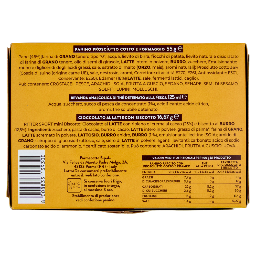 Panino prosciutto cotto e formaggio Bevanda analcolica di thé deteinato alla pesca Cioccolato al latte con biscotto - Cioccolato al latte con ripieno di crema al cacao (23%) e biscotto al BURRO (12,5%)