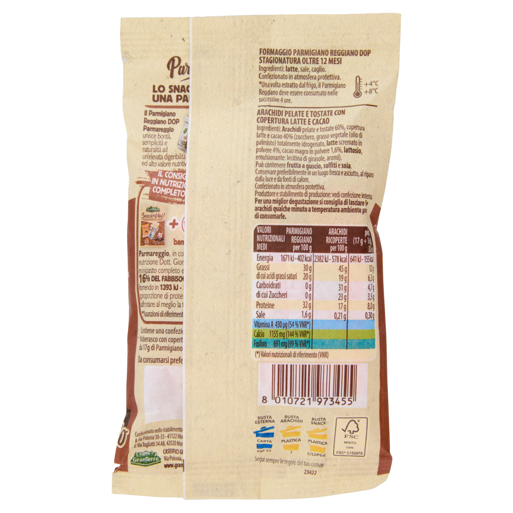 FrescoParmigiano Reggiano Confezionato in atmosfera protettiva. Temperatura di conservazione: +4°C / +8°C Arachidi ricoperte Conservare preferibilmente in un luogo fresco e asciutto, al riparo dalla luce e da fonti di calore. Confezionato in atmosfera protettiva.