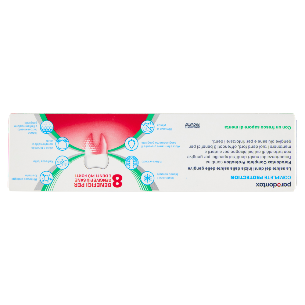 La salute dei denti inizia dalla salute delle gengive Parodontax Complete Protection combina l'esperienza dei nostri dentifrici specifici per gengive con tutto ciò di cui hai bisogno per aiutarti a mantenere i tuoi denti forti, offrendoti 8 benefici per gengive più sane e per rinforzare i denti. Con un fresco sapore di menta 8 Benefici per gengive più sane e denti più forti - Restituisce il bianco naturale - Pulisce a fondo - Aiuta a fermare e prevenire il sanguinamento gengivale - Rimuove la placca - Rinforza e protegge lo smalto - Rinfresca l'alito - Aiuta a tenere le gengive salde ai denti - Riduce l'arrossamento e l'infiammazione gengivale Clinicamente provato‡ ‡Salute delle gengive clinicamente provata