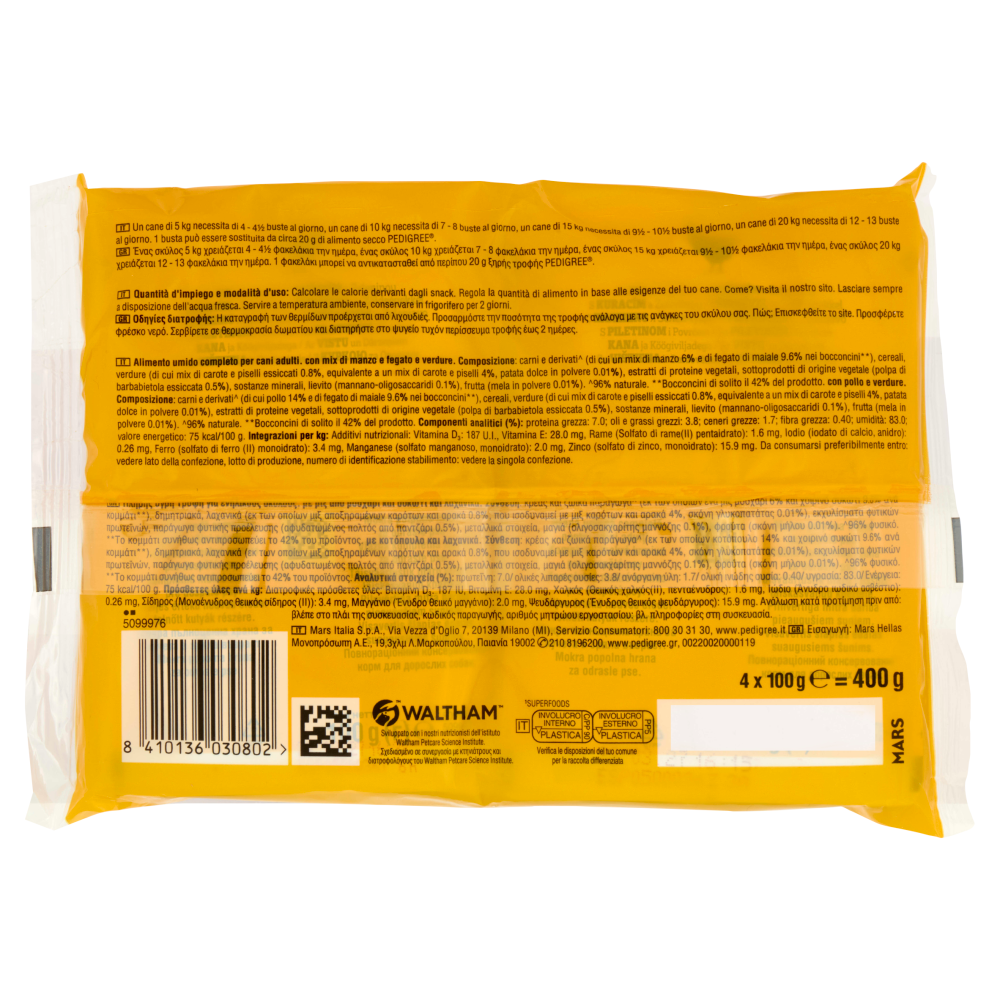 Un cane di 5 kg necessita di 4 - 4½ buste al giorno, un cane di 10 kg necessita di 7 - 8 buste al giorno, un cane di 15 kg necessita di 9½ - 10½ buste al giorno, un cane di 20 kg necessita di 12 - 13 buste al giorno. 1 busta può essere sostituita da circa 20 g di alimento secco Pedigree. Quantità d'impiego e modalità d'uso: Calcolare le calorie derivanti dagli snack. Regola la quantità di alimento in base alle esigenze del tuo cane. Come? Visita il nostro sito. Lasciare sempre a disposizione dell'acqua fresca. Servire a temperatura ambiente, conservare in frigorifero per 2 giorni.