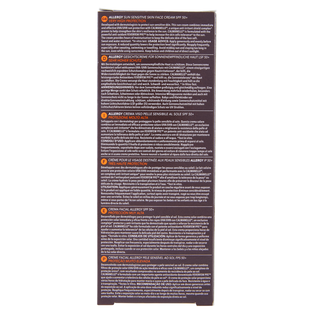 Sviluppata con i dermatologi per proteggere la pelle sensibile al sole. Questa crema solare combina un'immediata ed efficace protezione solare UVA/UVB con Calmanelle, un esclusivo complesso anti-irritante* che ha dimostrato di aiutare a migliorare la resistenza della pelle al sole. Il Calmanelle è formulato con Feverfew PFE un potente anti-ossidante che aiuta ad aumentare la tolleranza della pelle al sole*. La crema assicura ore di idratazione per mantenere morbida la pelle del viso. Resistente al sudore e all'acqua. *Test in vitro.